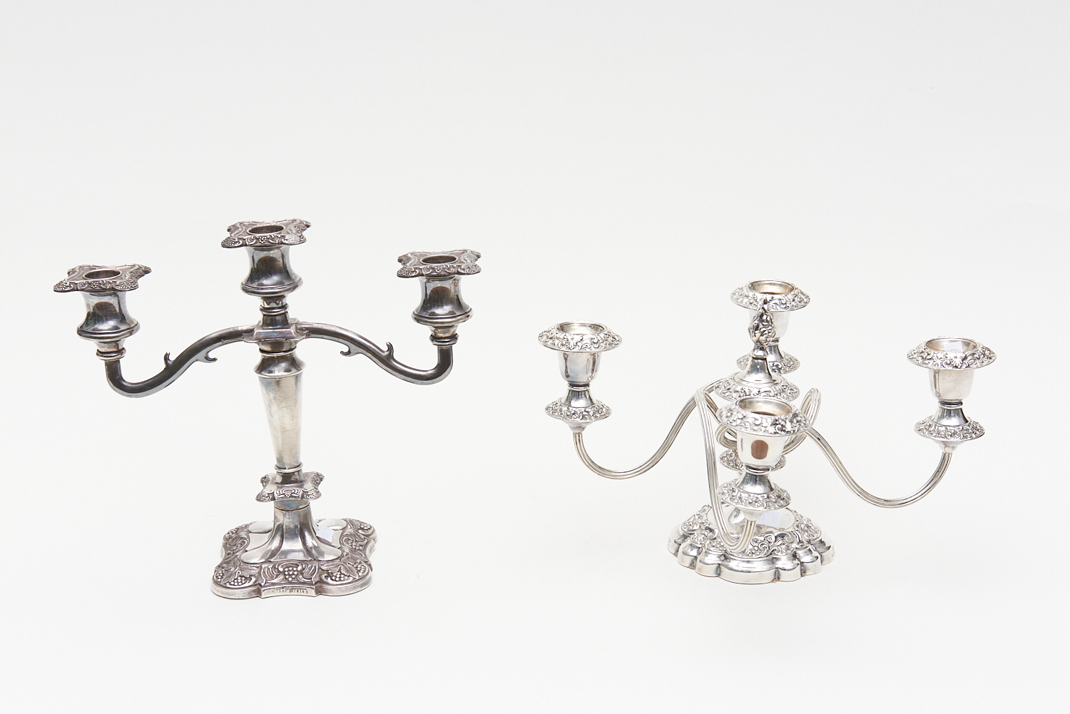 TWO SILVERPLATED CANDELABRAS INCLUDING THREE AND FIVE SCONCE H.25CM, LEONARD JOEL LOCAL DELIVERY SIZE: MEDIUM