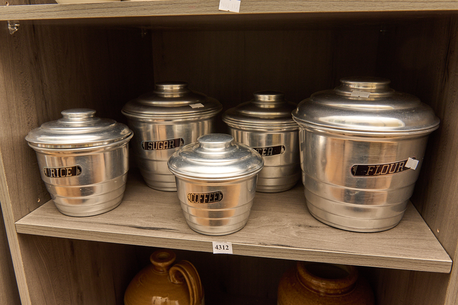FIVE GRADUATED ALUMINIUM VILLA WARE KITCHEN CANNISTERS H.19CM (TALLEST), LEONARD JOEL LOCAL DELIVERY SIZE: MEDIUM