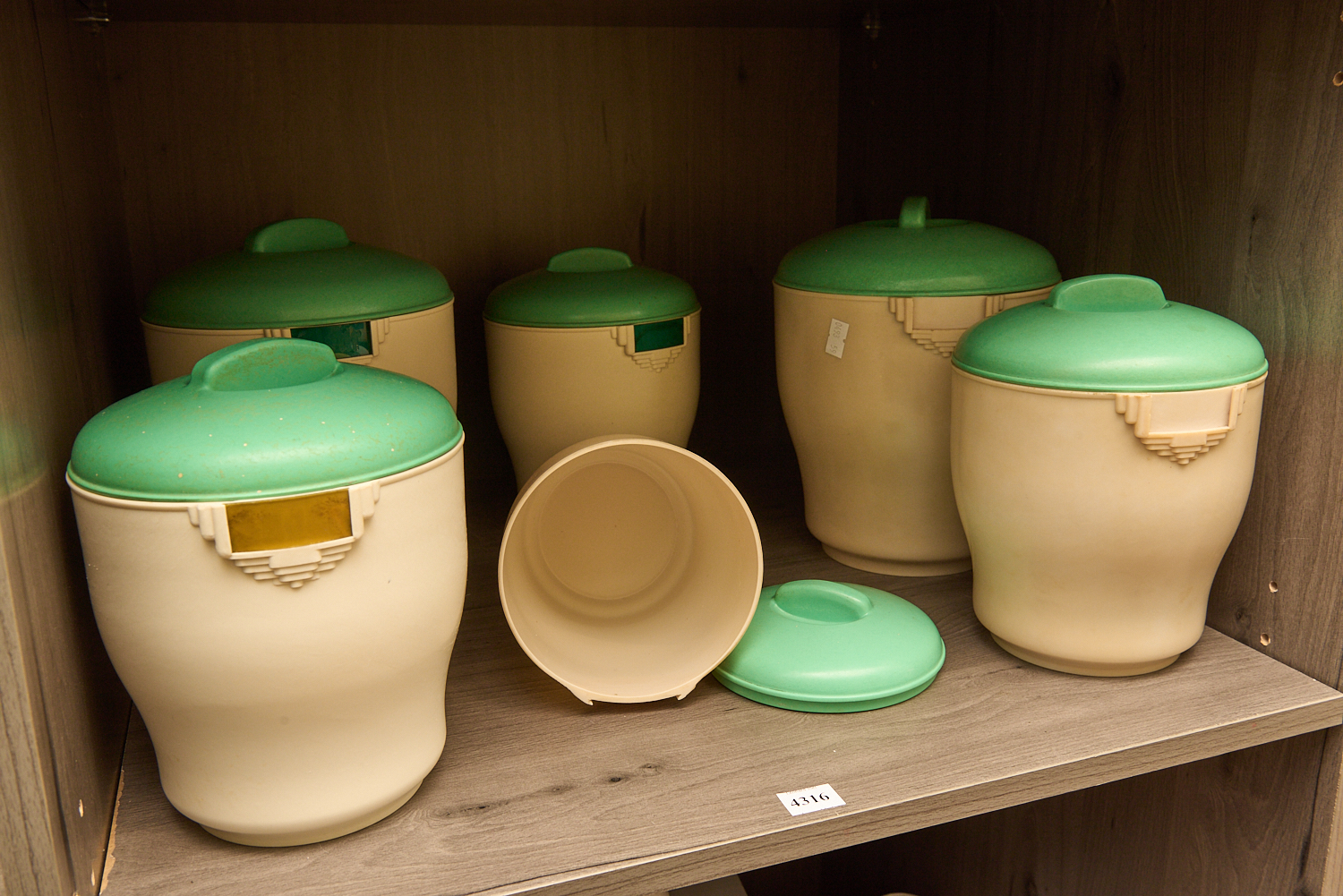 A SET OF SIX VINTAGE BAKELITE LIDDED KITCHEN CANNISTERS (A/F) H.23.5CM (TALLEST), LEONARD JOEL LOCAL DELIVERY SIZE: MEDIUM