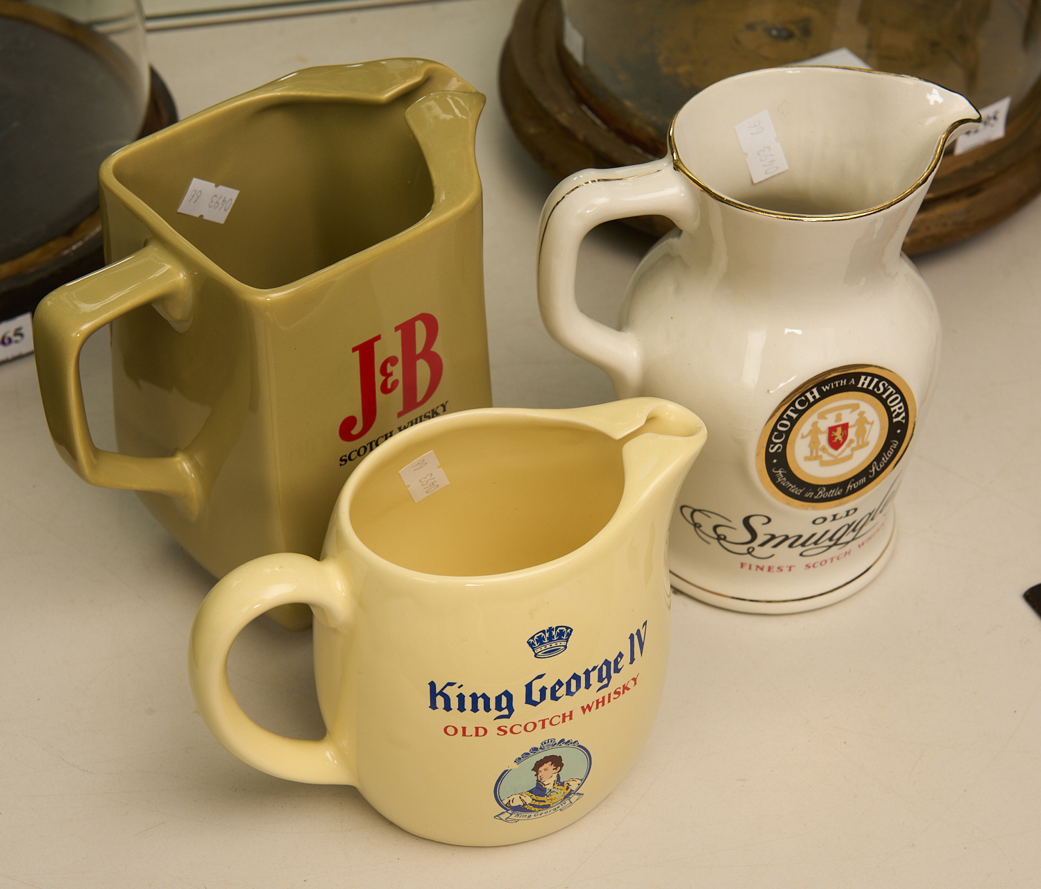 THREE ADVERTISING WHISKY JUGS INCLUDING J & B BY WADE KING GEORGE BY WADE AND OLD SMUGGLER H.19CM (TALLEST), LEONARD JOEL LOCAL DELIVERY SIZE: MEDIUM