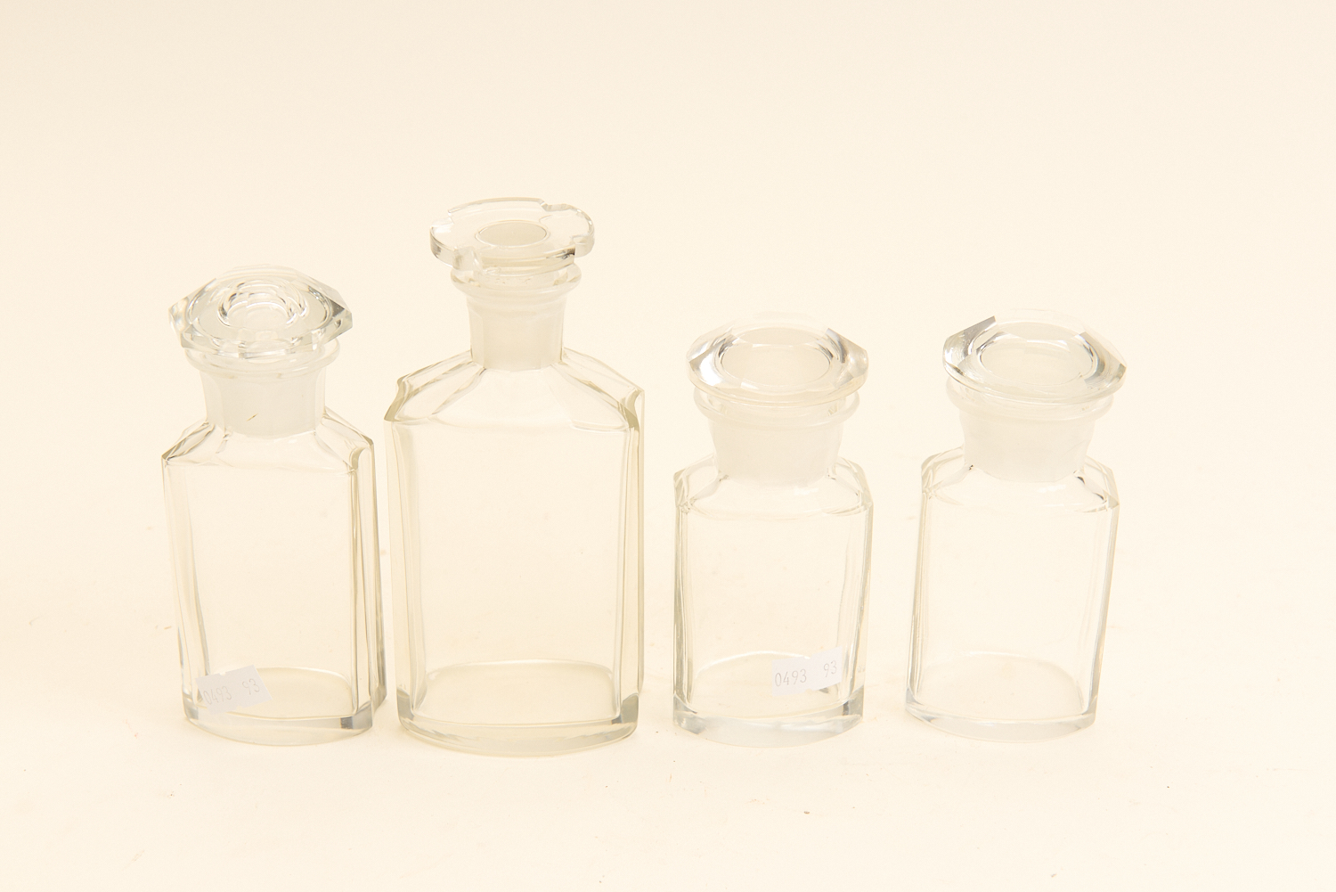 FOUR FACETED CHEMIST BOTTLES H.15CM, LEONARD JOEL LOCAL DELIVERY SIZE: SMALL
