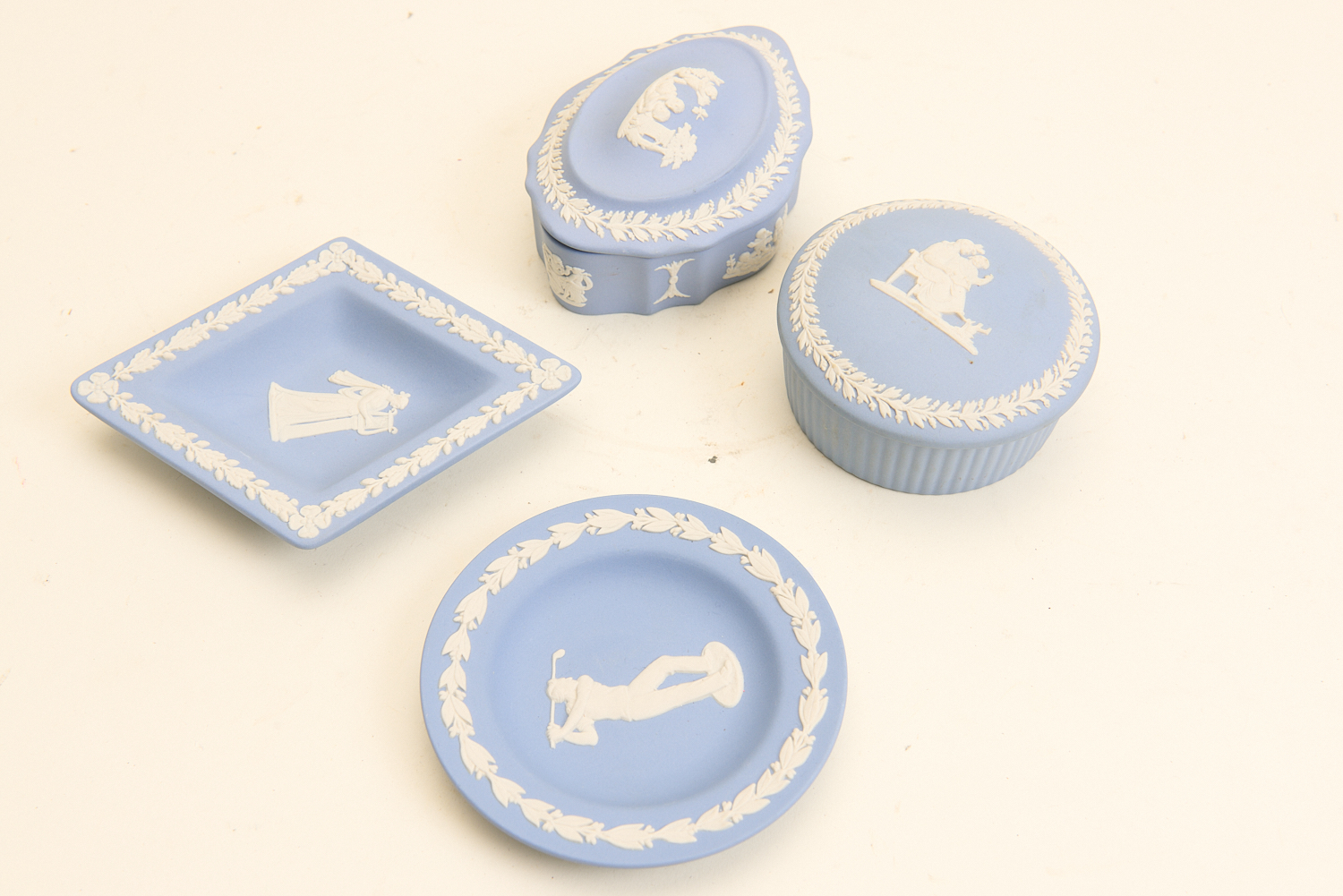 FOUR WEDGWOOD BLUE JASPERWARE PLATES AND LIDDED TRINKETS, LEONARD JOEL LOCAL DELIVERY SIZE: SMALL