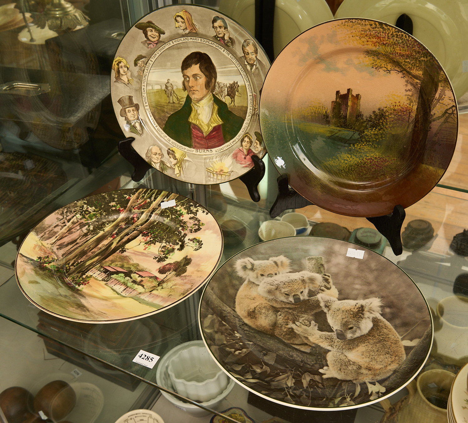 FOUR ROYAL DOULTON DINNER DISPLAY PLATES INCLUDING AUSTRALIAN THEMED AND ROBBIE BURNS DIA.26CM, LEONARD JOEL LOCAL DELIVERY SIZE: MEDIUM