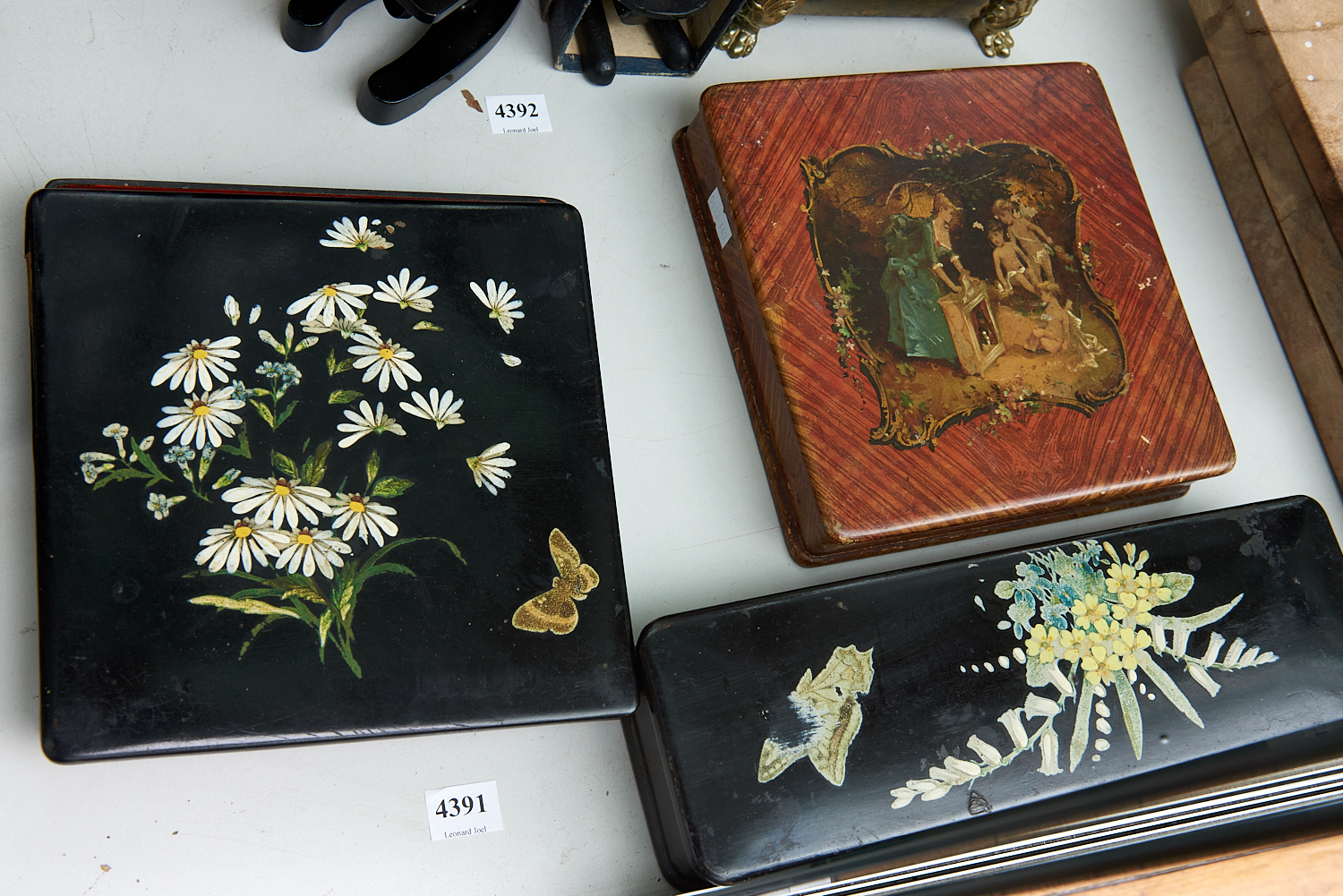 THREE PAPIER MACHE PAINTED BOXES H.4.5CM X W.31CM X D.9.5CM (LARGEST), LEONARD JOEL LOCAL DELIVERY SIZE: SMALL