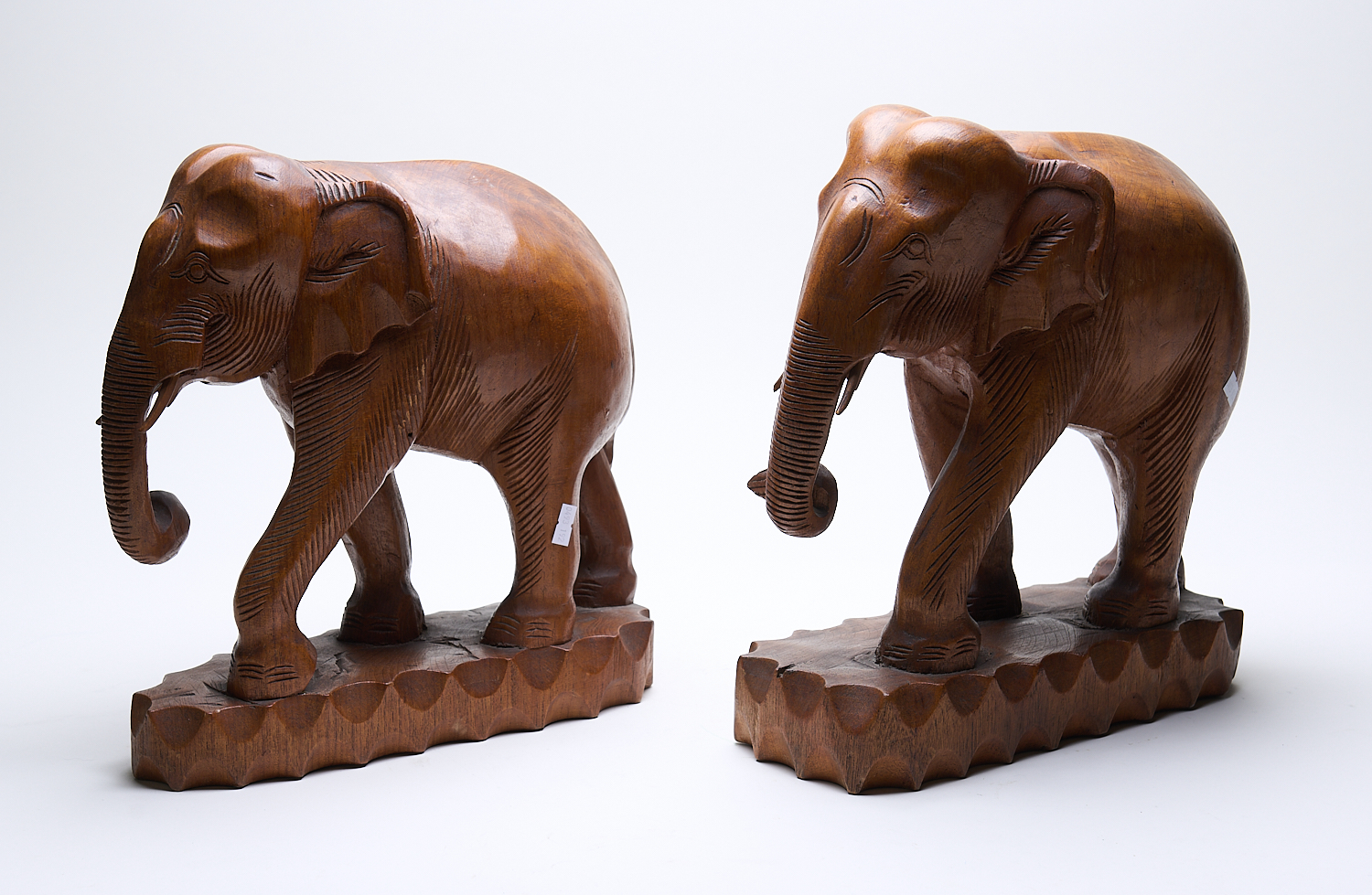 A PAIR OF VINTAGE CARVED WOODEN ELEPHANT FIGURES H.34.5CM, LEONARD JOEL LOCAL DELIVERY SIZE: MEDIUM