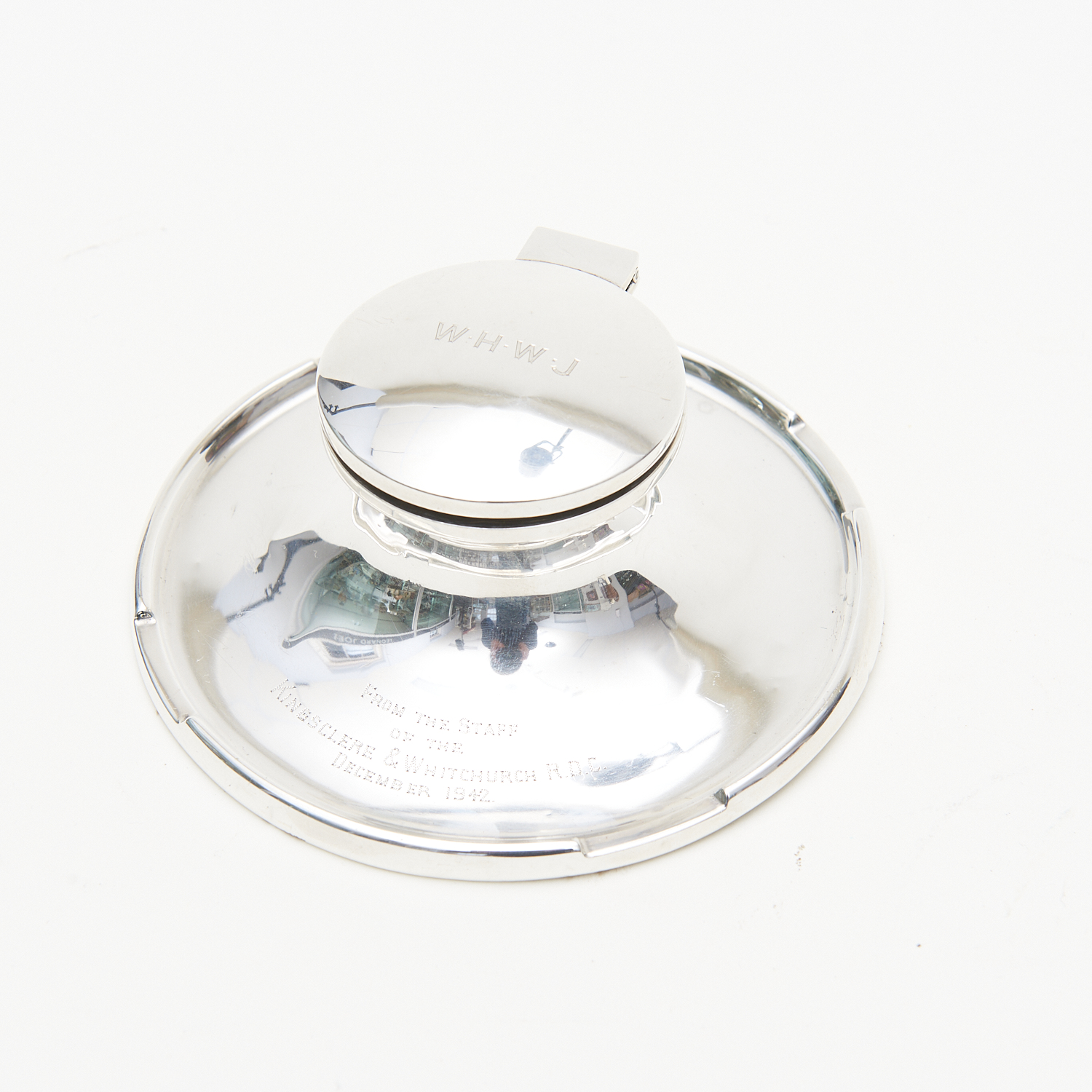 A STERLING SILVER DESK INKWELL WITH GLASS LINER DIA.13CM, LEONARD JOEL LOCAL DELIVERY SIZE: SMALL