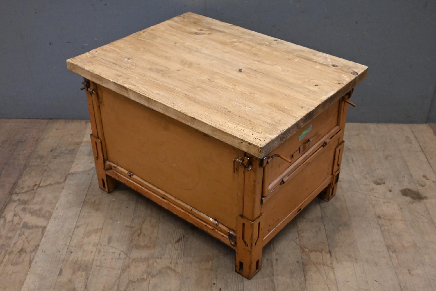 A LARGE INDUSTRIAL TIMBER TOPPED COFFEE TABLE (A/F) (H58 X W66 X D86 CM) (PLEASE NOTE THIS HEAVY ITEM MUST BE REMOVED BY CARRIERS AT THE CUSTOMER'S EXPENSE. LEONARD JOEL STAFF CANNOT ASSIST CARRYING THIS ITEM) (X-LARGE ITEM)