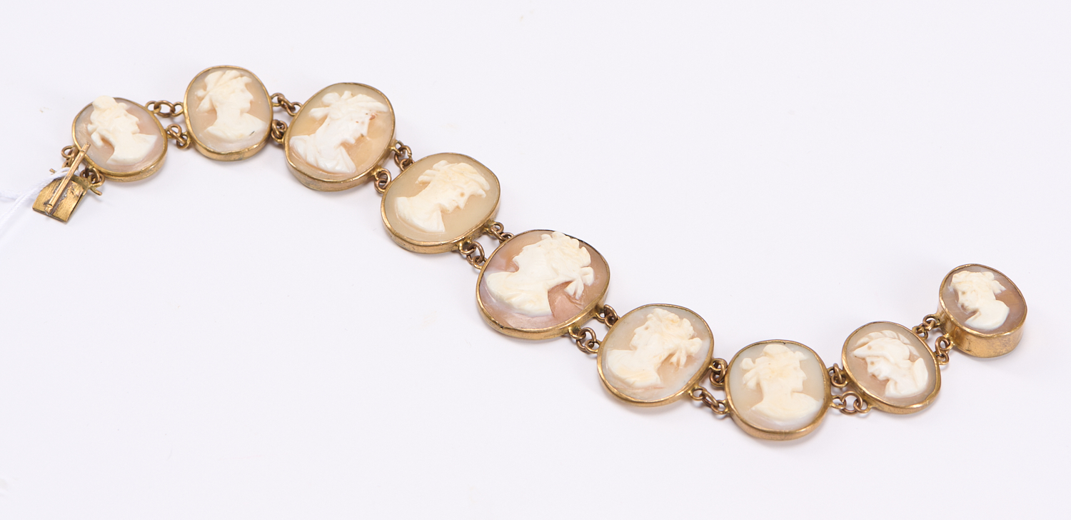 AN ANTIQUE CAMEO BRACELET, COMPRISING NINE SHELL CAMEOS IN PINCHBECK MOUNTS, TOTAL LENGTH APPROXIMATELY 200MM