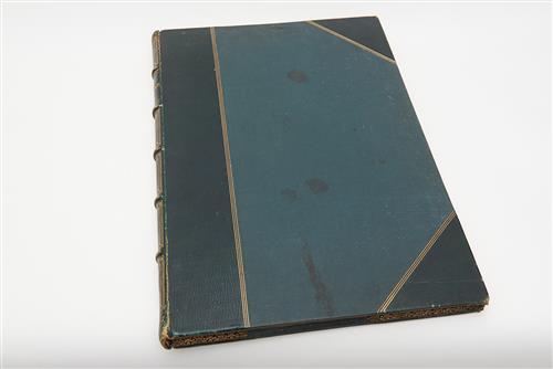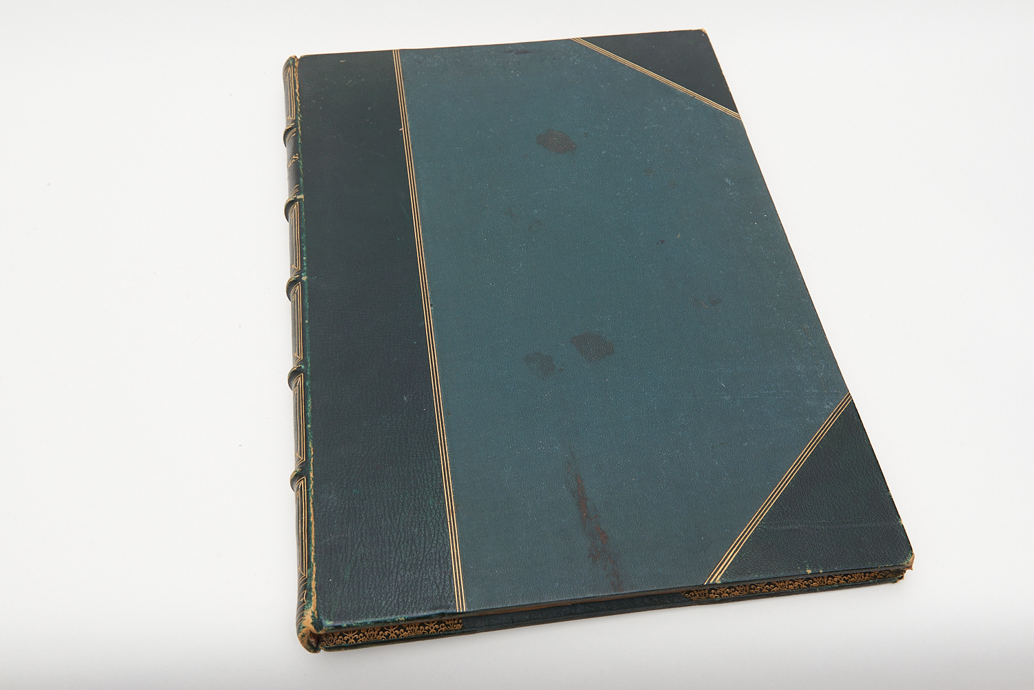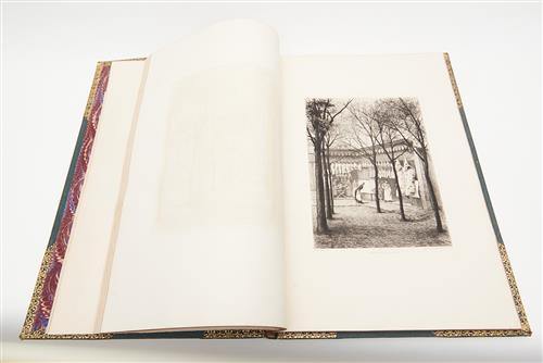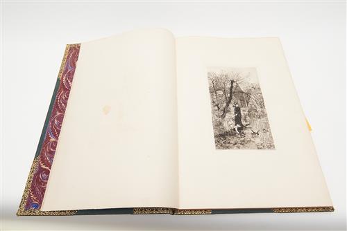 A 19TH C LEATHER BOUND BOOK OF ETCHINGS - APPROXIMATELY 72 INCLUDING E. BRETOU, ALBERTO MASO AND PAULO MICHETTII, LEONARD JOEL LOCAL DELIVERY SIZE: MEDIUM