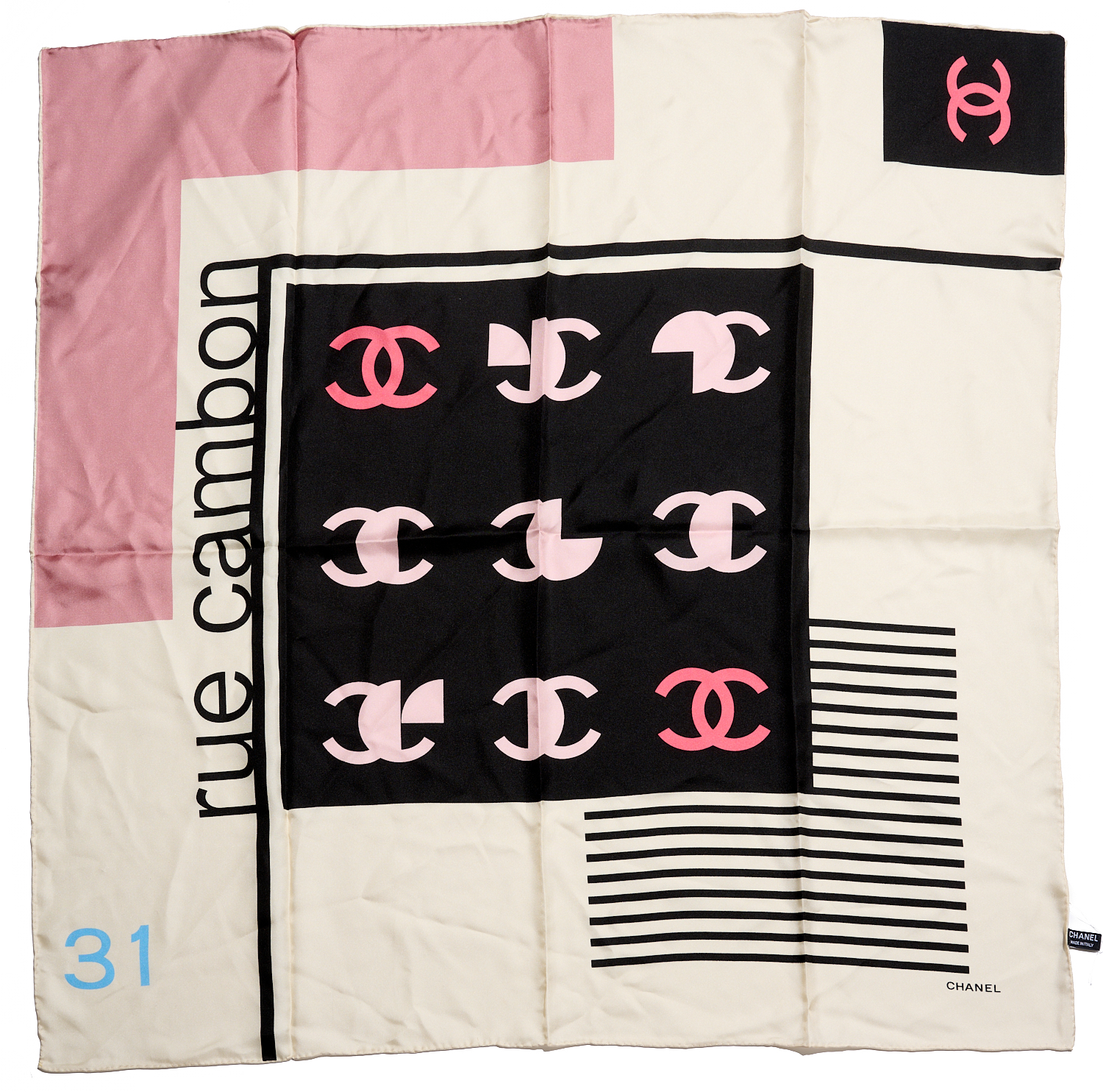 A 31 RUE DE CAMBON CC PRINT SILK SCARF BY CHANEL - Styled in pink, beige and black silk, featuring geometric CC logo variations, with rolled edges, 90cm square.