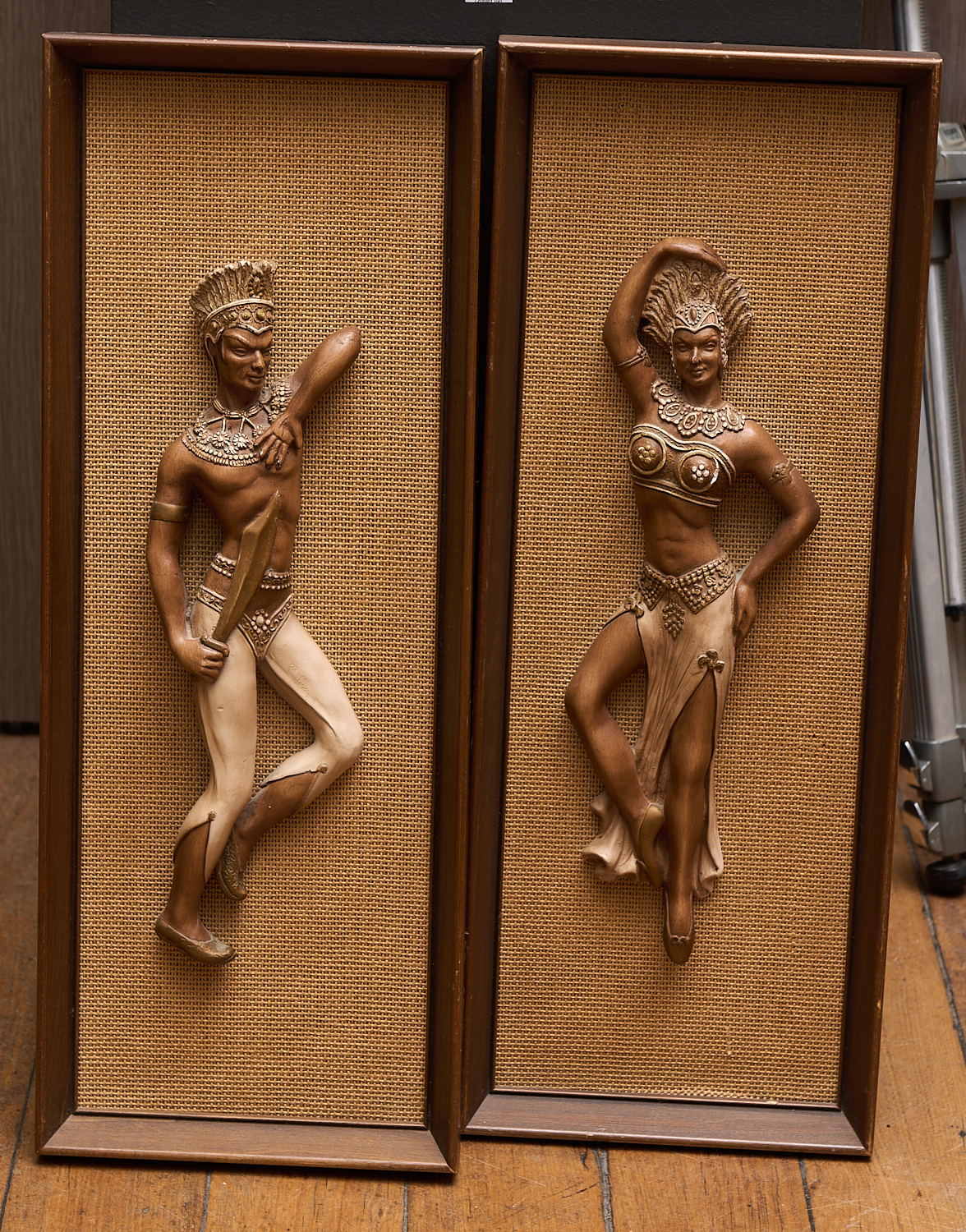 A PAIR OF FRAMED WALL PLAQUES PRODUCED AND FRAMED BY GIROTTI SCULPTURED ART GALLERY, ST CATHERINES, ONTARIO, CANADA, CIRICA 1960 H.61CM X W.23CM, LEONARD JOEL LOCAL DELIVERY SIZE: MEDIUM