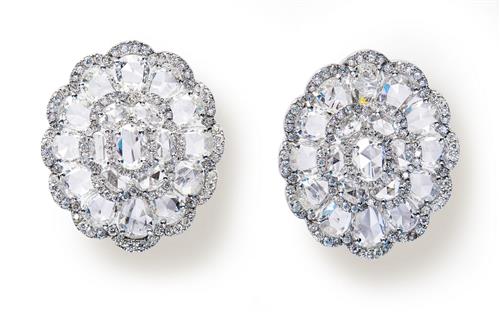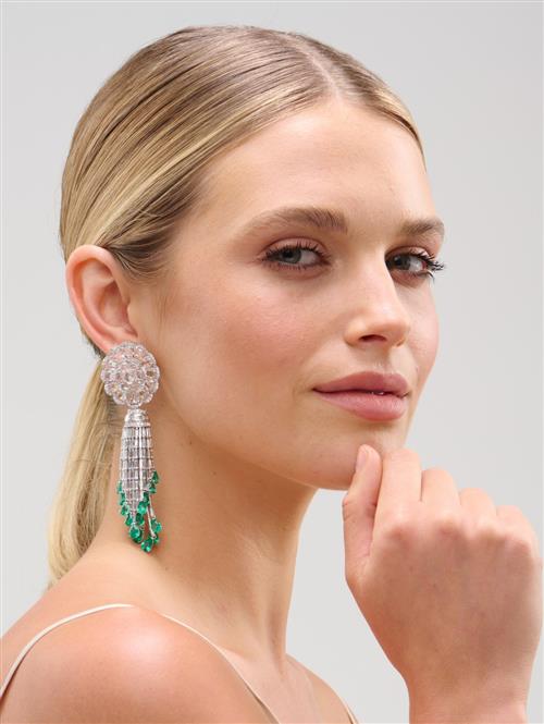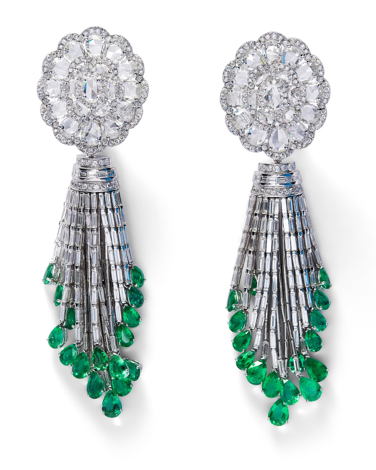Each surmount modelled as a detachable flowerhead decorated with oval and pear-shaped rose-cut diamonds, framed by brilliant-cut diamonds supporting 16 graduated cascading lines of baguette diamonds terminating on claw-set pear-shaped emerald swing-drops, the diamonds and emeralds together weighing approximately 29.11 carats and 13.46 carats respectively, mounted in 18ct white gold, length 100mm, post and omega clip fittings.