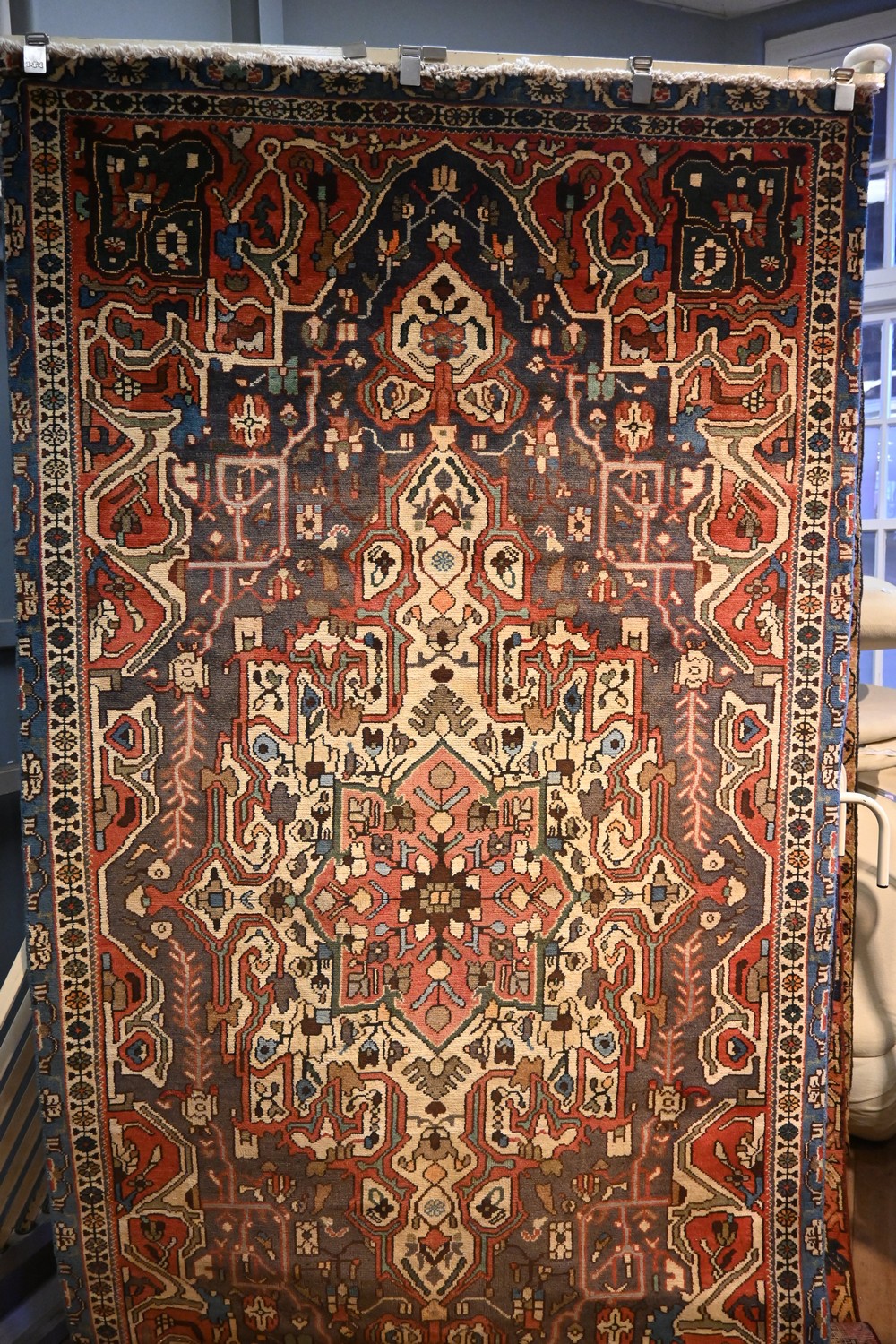 MOST COLOUR FULL PERSIAN BAKHTIARI CHAR MAHAL RUG. 100% NATURAL ORGANIC DYES, HAND KNOTTED WITH 100% HAND SPUN WOOL, CIRCA 1960S WITH SUPERB PICK OF COLOURS IN A SEMI VINTAGE WOOLLEN PILE. BAKHTIARI WEAVERS ARE RENOWNED FOR THEIR COLOUR FULL UNIQUE RUGS AMONGST ALL PERSIAN WEAVERS. EX-GALLERY RUG. SIZE: 280 X 143 CM ORIGIN: IRAN – RRP: $2,400 DOCUMENTATION OF AUTHENTICITY INCLUDED