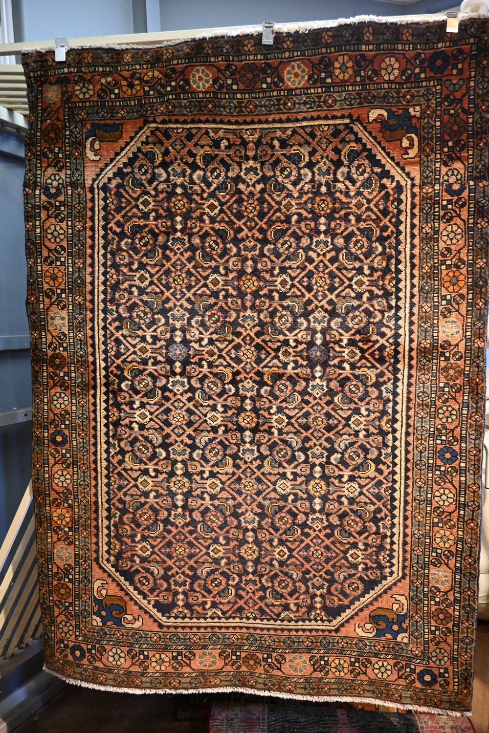 EX-GALLERY FARAHAN DESIGN PERSIAN HAMEDAN WEAVE LARGE NOMADIC RUG. HAND KNOTTED WITH 100% WOOLLEN PILE ALSO 100 % NATURAL DYES WITH AN INTRICATE AND DETAILED HERATI OR MAHI ALL OVER MOTIFS. SUPERBLY DESIGNED WITH A TOTALLY WELL BALANCE COLOUR COMBINATION OF DEEP PERSIAN INDIGO BLUE FIELD SURROUNDED BY SOFT RED AND CHAMPAGNE TONES IN THE HERATI MOTIFS, FINISHED WITH AN OUTER COLOUR FULL MAIN BORDER IN GREYS, BLUE AND SOFT REDS. CIRCA 1960S AND RESTORED TO GALLERY CONDITION. SIZE: 210 X 145 CM ORIGIN: PERSIA – RRP: $1,800 DOCUMENTATION OF AUTHENTICITY INCLUDED