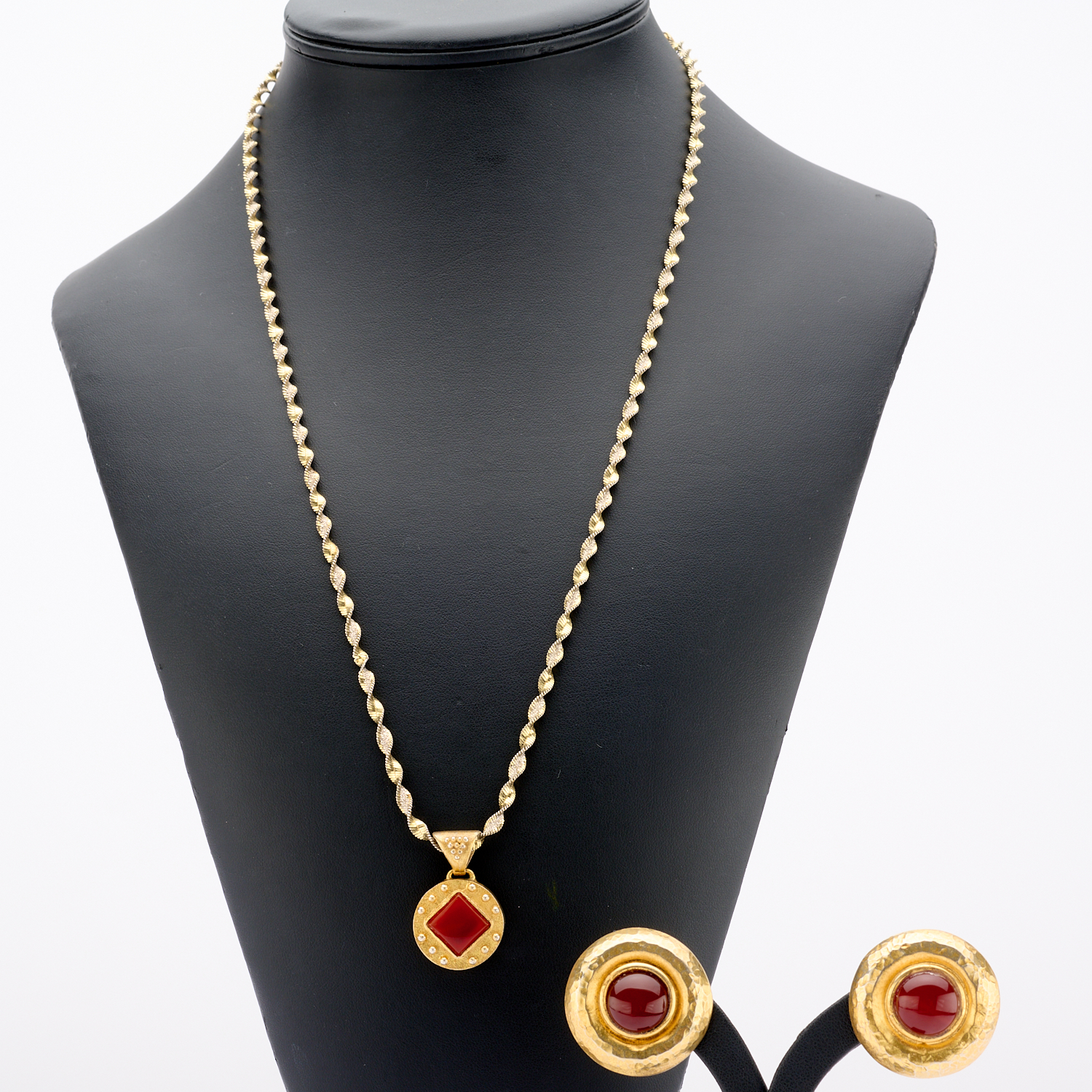 A PAIR OF AGATE SET CLIP ON EARRINGS IN SILVER GILT, TO CONFORMING PENDANT TO AN AN ITALIAN TWISTED CHAIN IN GOLD PLATED STERLING SILVER, THE EARRINGS DIAMETER APPROXIMATELY 31MM AND CHAIN APPROXIMATELY 58MM