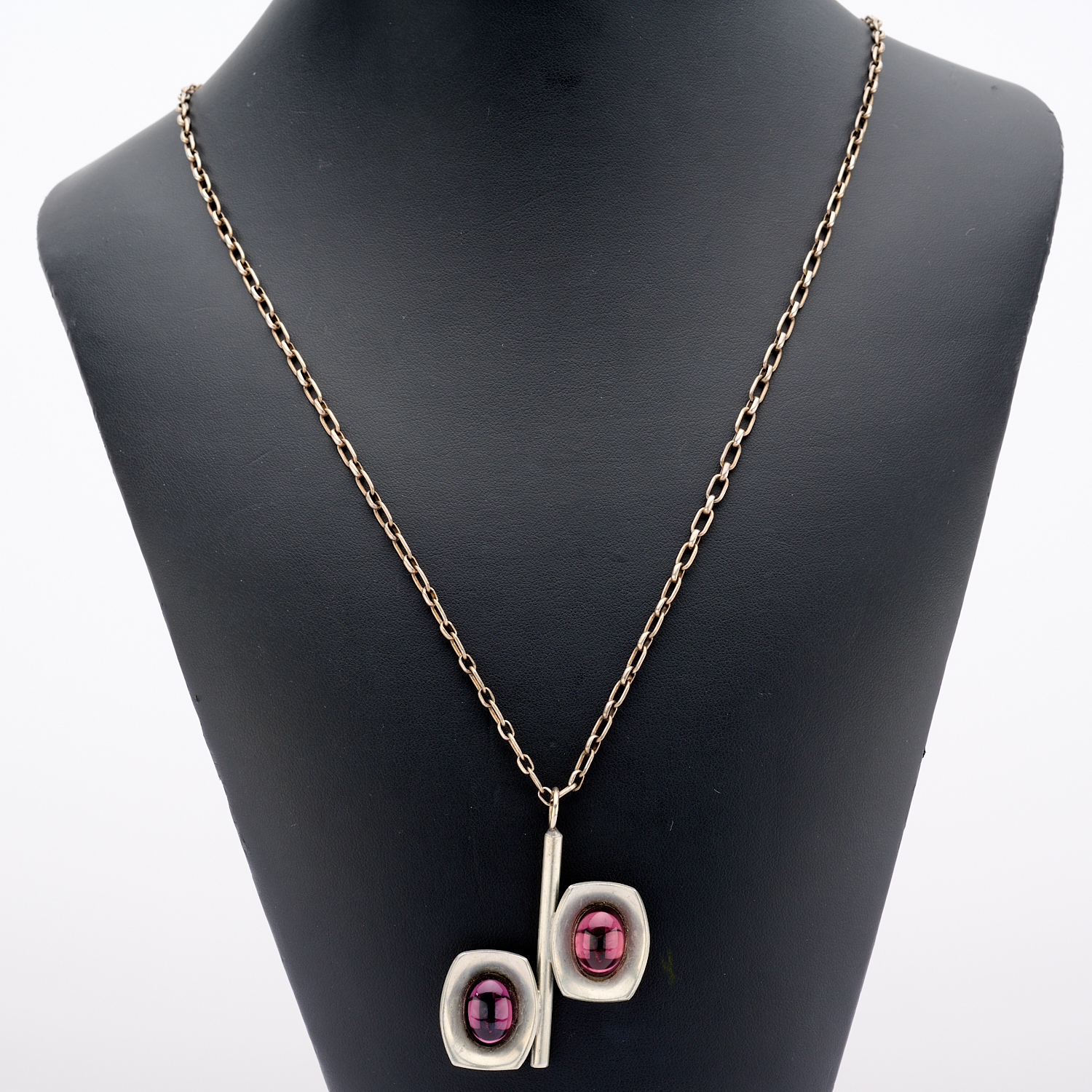 A MODERNIST DANISH PENDANT IN PEWTER BY JORGEN JENSEN, FEATURING PURPLE OVAL CUT EN CABOCHON GLASS, CIRCA 1960'S, THE PENDANT MEASURING 55 X 37MM