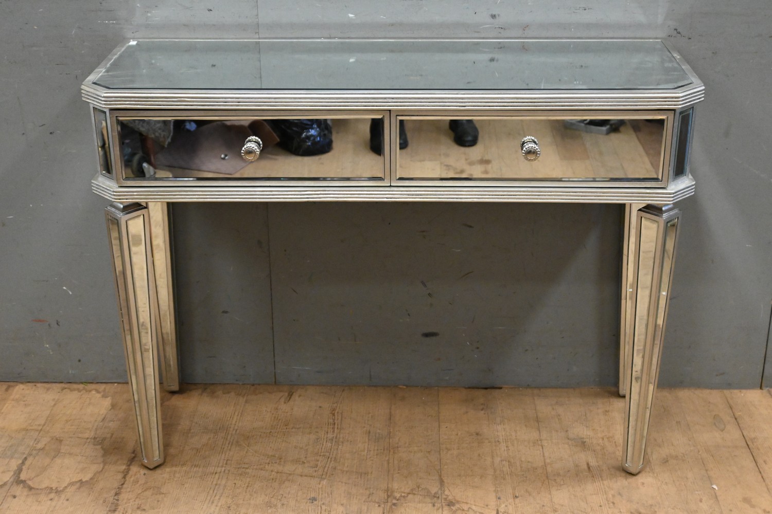 A CONTEMPORARY MIRROR PANELLED TWO DRAWER HALL TABLE (A/F) (80H X 110W X 40D CM) (PLEASE NOTE THIS HEAVY ITEM MUST BE REMOVED BY CARRIERS AT THE CUSTOMER'S EXPENSE. LEONARD JOEL STAFF CANNOT ASSIST CARRYING THIS ITEM) (X-LARGE ITEM)