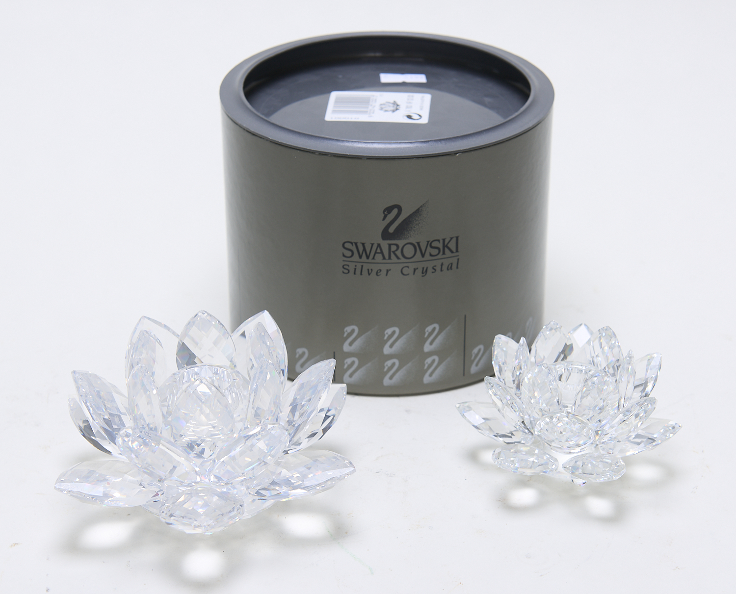 TWO SWAROVSKI LOTUS CANDLE HOLDERS WITH ORIGINAL BOXES DIA.13CM, LEONARD JOEL LOCAL DELIVERY SIZE: SMALL