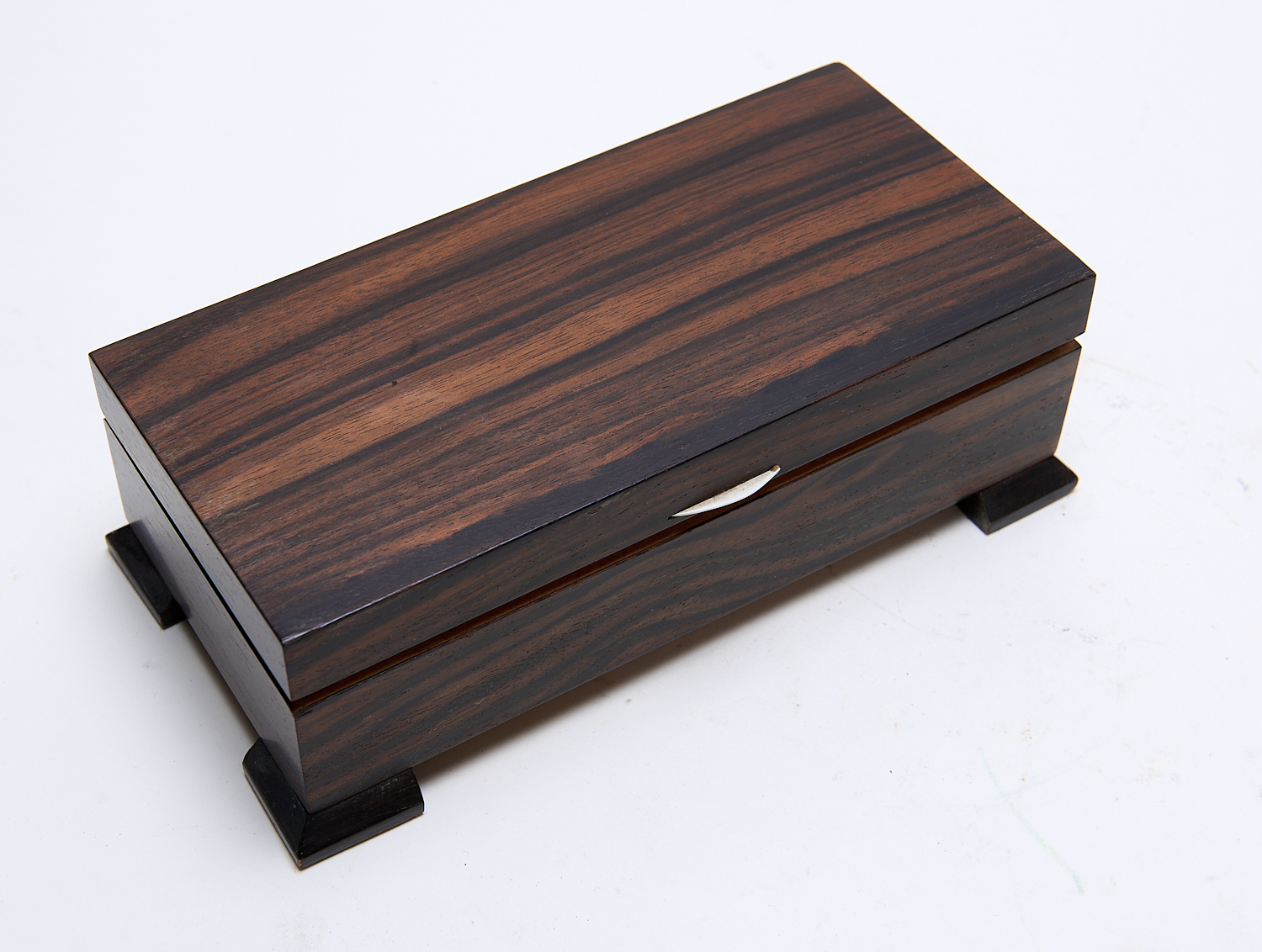 A FRENCH ART DECO ROSEWOOD MUSICAL CIGARETTE BOX H.6.5CM X W.21.5CM X D.10.5CM, LEONARD JOEL LOCAL DELIVERY SIZE: SMALL