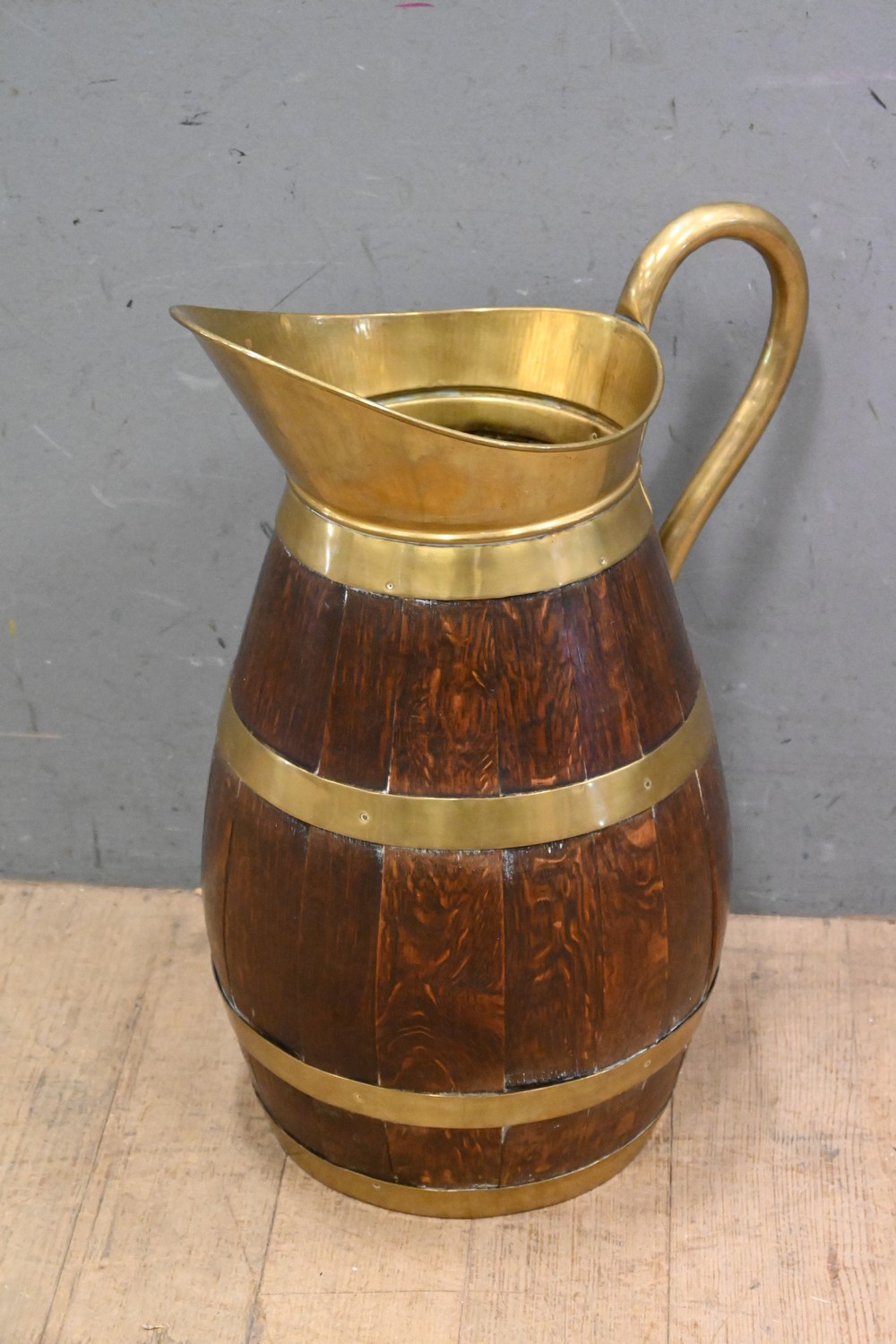 A FRENCH COOPERED OAK AND BRASS BOUND TAVERN JUG (50H CM) (LEONARD JOEL DELIVERY SIZE: MEDIUM)