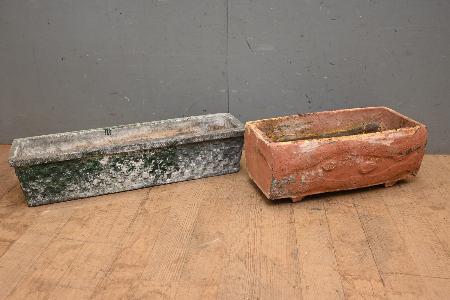 TWO AUSTRALIAN CONCRETE GARDEN TROUGHS (A/F) (24H X 60W X 27D CM) (PLEASE NOTE THIS HEAVY ITEM MUST BE REMOVED BY CARRIERS AT THE CUSTOMER'S EXPENSE. LEONARD JOEL STAFF CANNOT ASSIST CARRYING THIS ITEM) (X-LARGE ITEM)
