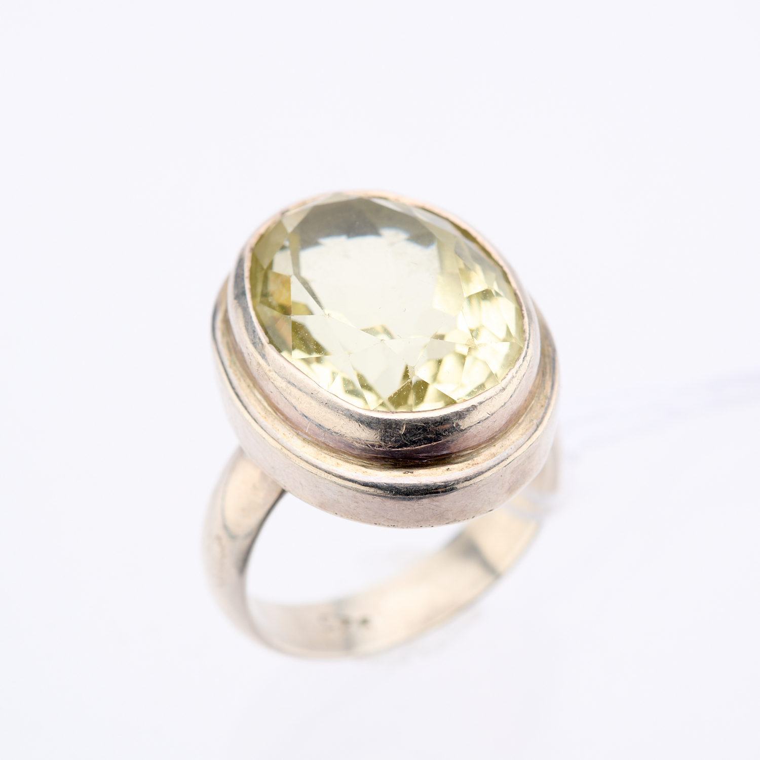 A MIXED OVAL CUT PRASIOLITE SET DRESS RING IN STERLING SILVER, RING SIZE M, THE PRASIOLITE MEASURING APPROXIMATELY 17.80 X 12.22MM (MEASURED IN SETTING)
