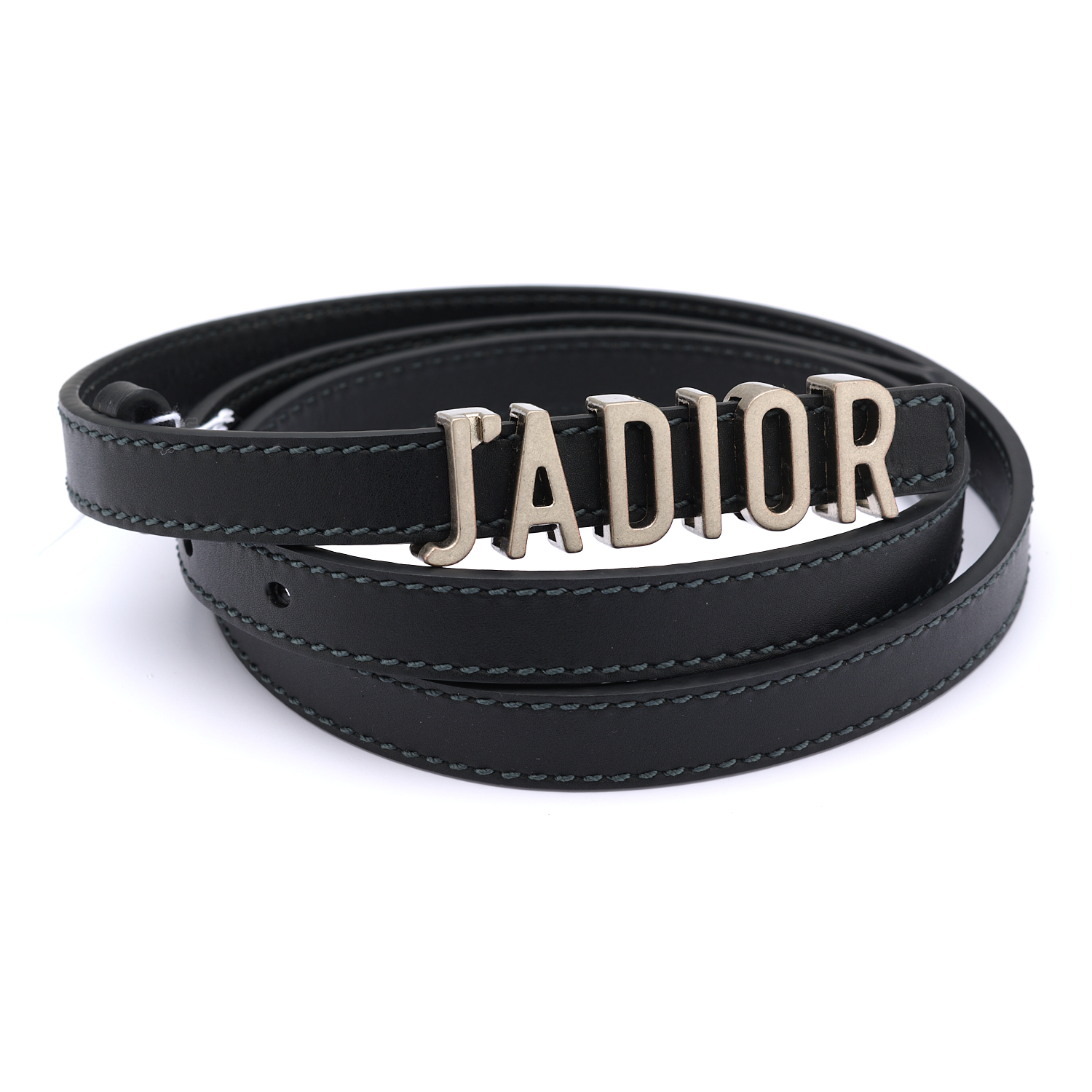 A J'ADIOR BELT BY DIOR - Styled in black leather, with signature J'Adior logo buckle in silver tone metal, marked size 90.