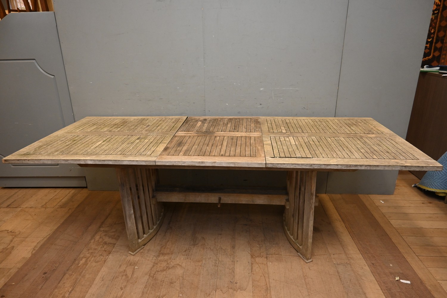 AN OUTDOOR TEAK EXTENSION DINING TABLE (A/F) (96H X 240W X 100D CM) (PLEASE NOTE THIS HEAVY ITEM MUST BE REMOVED BY CARRIERS AT THE CUSTOMER'S EXPENSE. LEONARD JOEL STAFF CANNOT ASSIST CARRYING THIS ITEM) (X-LARGE ITEM)