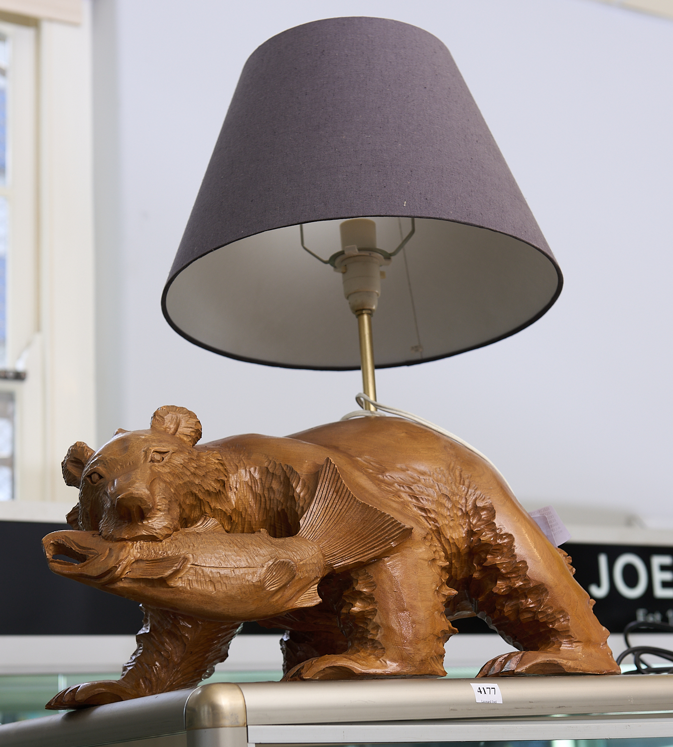 A CARVED WOODEN BEAR AND FISH TABLE LAMP WITH GREY FABRIC SHADE H.63CM X W.51CM, LEONARD JOEL LOCAL DELIVERY SIZE: MEDIUM