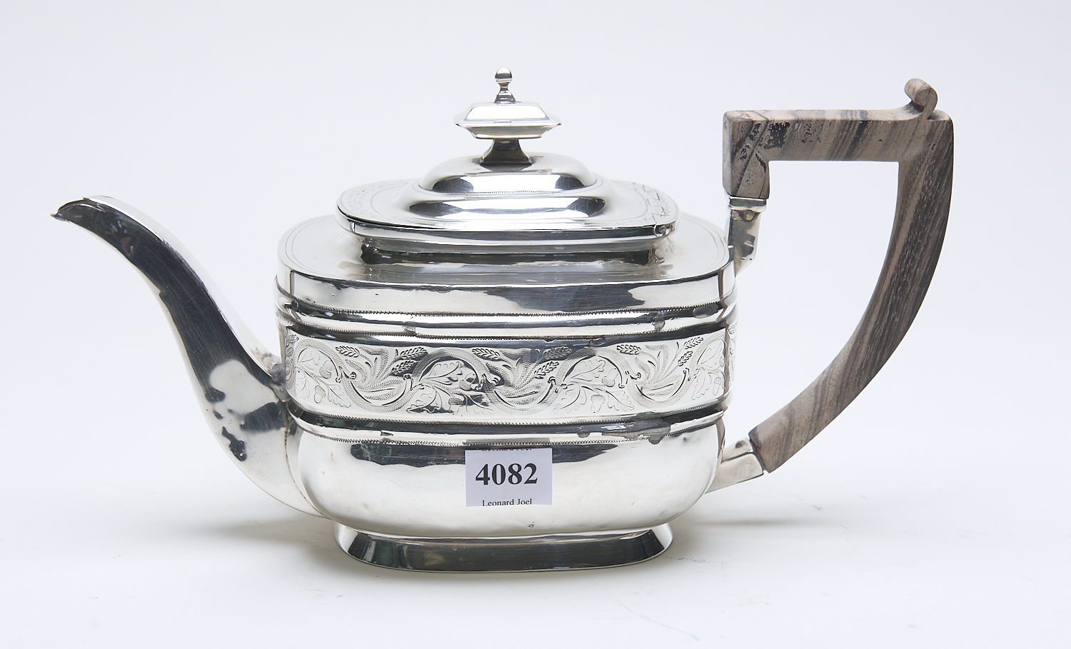 A STERLING SILVER TEAPOT WITH WOODEN HANDLE – 509 GRAMS (A/F REPAIR TO BASE PLATE, GEORGIAN HALLMARKS) H.16CM X W. 27CM, LEONARD JOEL LOCAL DELIVERY SIZE: SMALL
