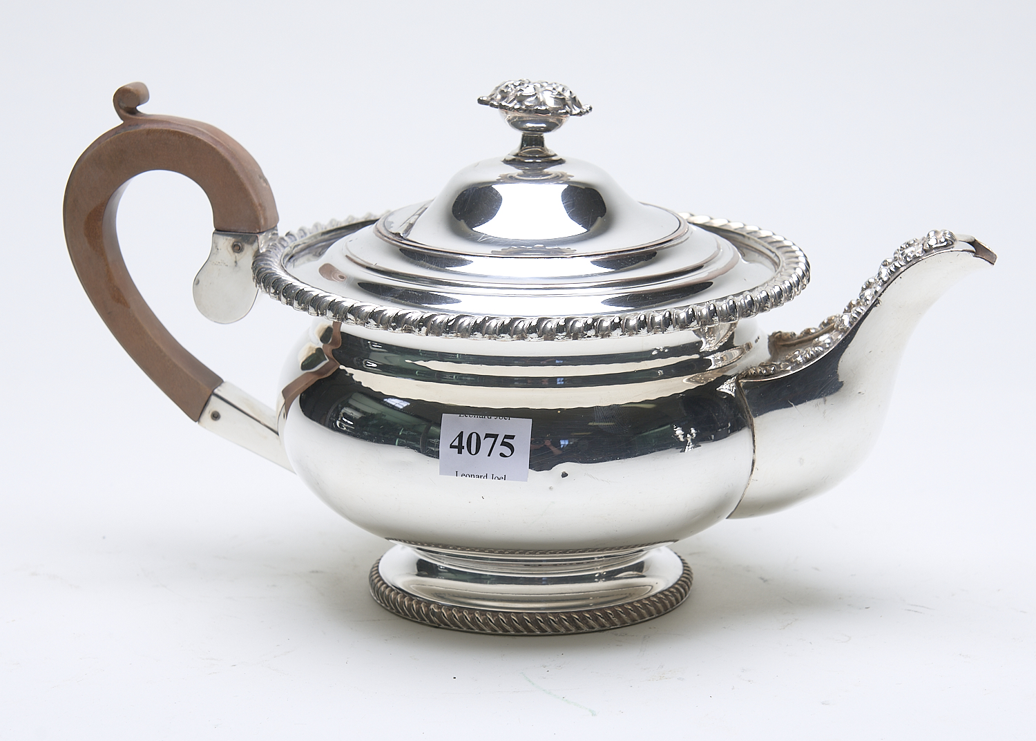 A 19TH CENTURY ENGLISH SHEFFIELD PLATE TEAPOT WITH GADROONED BORDER AND WOODEN HANDLE, LEONARD JOEL LOCAL DELIVERY SIZE: SMALL