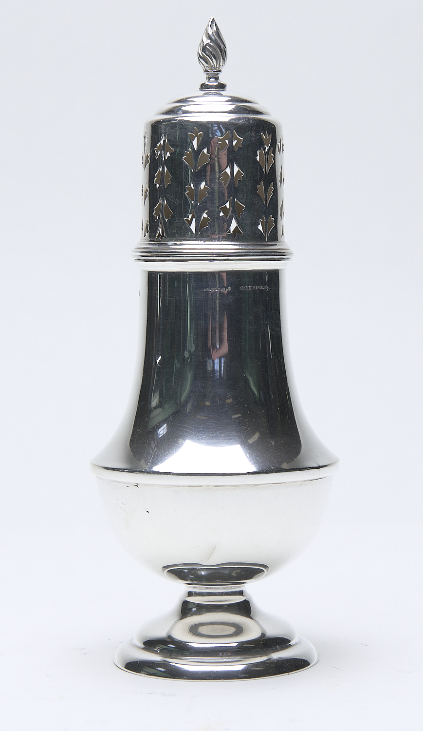 A STERLING SILVER SUGAR CASTOR – 147 GRAMS H.19.5CM, LEONARD JOEL LOCAL DELIVERY SIZE: SMALL