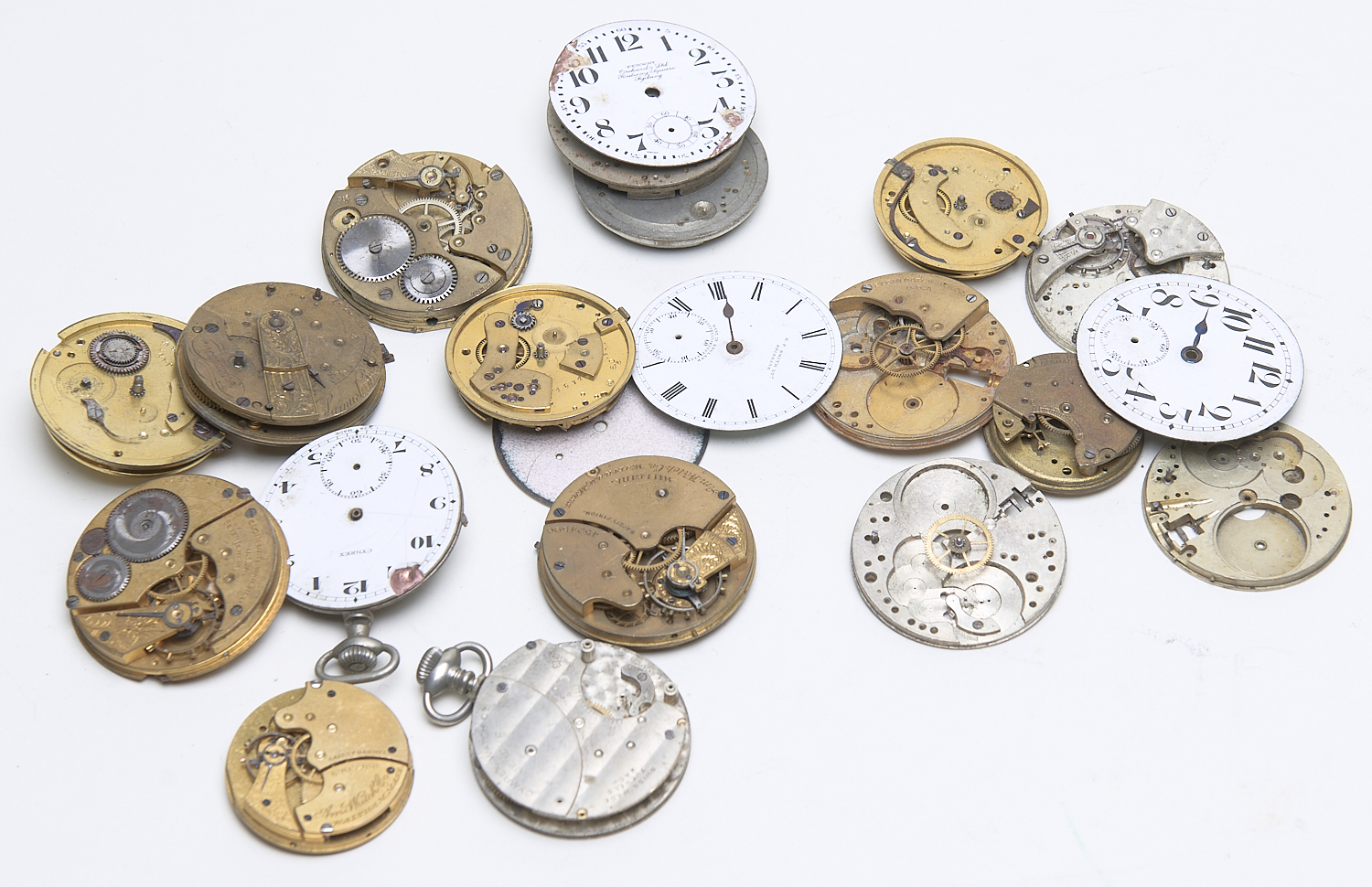 A COLLECTION OF ANTIQUE POCKET WATCH MOVEMENTS AND SOME ENAMEL DIALS, LEONARD JOEL LOCAL DELIVERY SIZE: SMALL