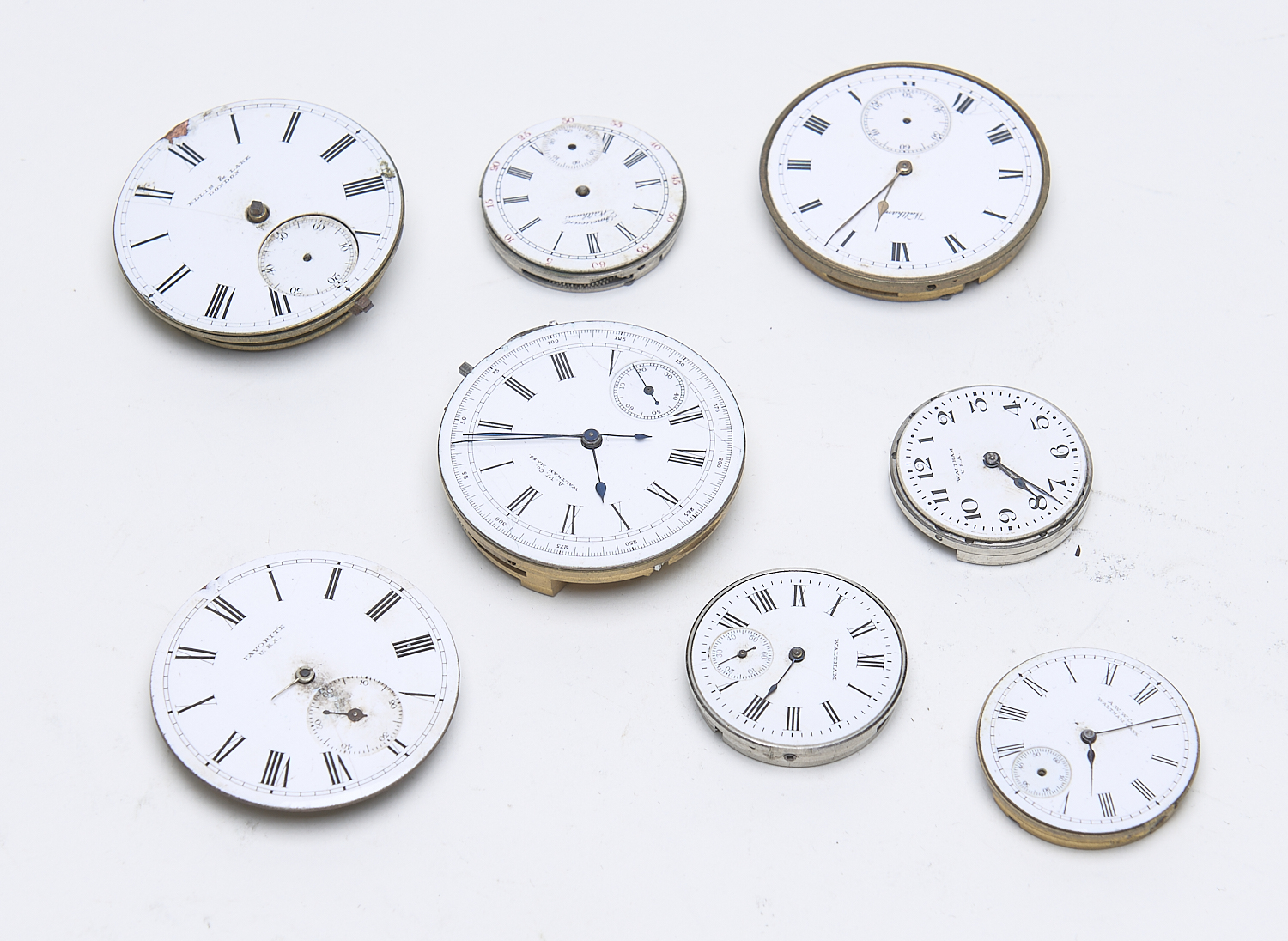 COLLECTION OF EIGHT ANTIQUE POCKET WATCH MOVEMENTS – ALL WITH ENAMEL FACES, LEONARD JOEL LOCAL DELIVERY SIZE: SMALL