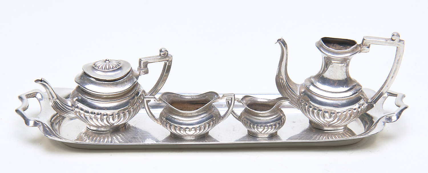 AN ANTIQUE ENGLISH MINIATURE STERLING SILVER TEA AND COFFEE SET ON TRAY L.15CM (A/F), LEONARD JOEL LOCAL DELIVERY SIZE: SMALL