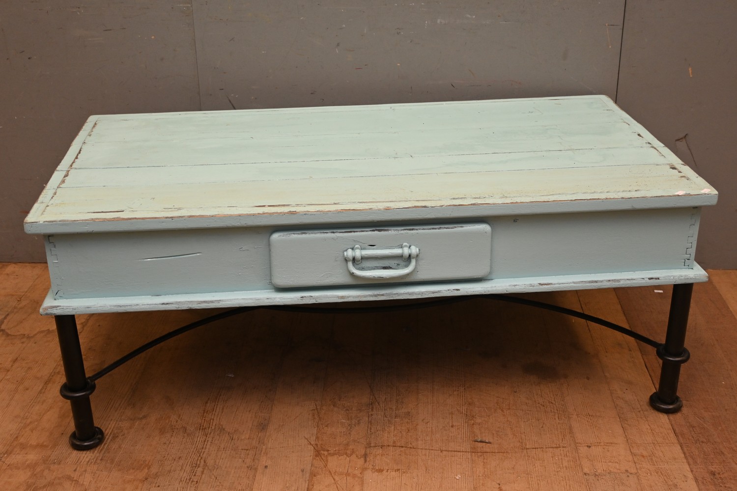 A TURQUIOSE PAINTED SINGLE DRAWER COFFEE TABLE ( A/F) ( 51H X 133W X 72D CM) (LEONARD JOEL DELIVERY SIZE: LARGE)