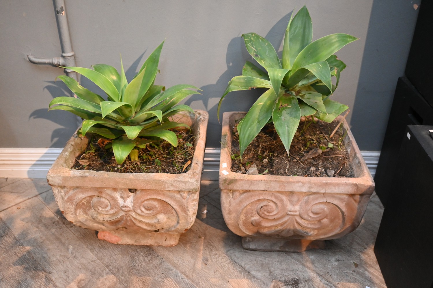 A PAIR OF FRENCH TERRACOTTA JARDINAIRES WITH RAISED DETAILING (31H X 43W X 43D CM) (PLEASE NOTE THIS HEAVY ITEM MUST BE REMOVED BY CARRIERS AT THE CUSTOMER'S EXPENSE. LEONARD JOEL STAFF CANNOT ASSIST CARRYING THIS ITEM) (X-LARGE ITEM)