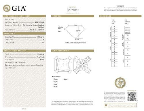 Accompanied by a GIA report numbered 2387353862, dated 24 April 2021, stating that the 1.71 carat diamond is F colour, SI1 clarity, laser inscribed.
