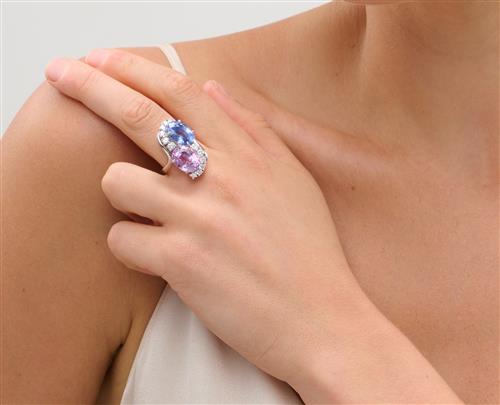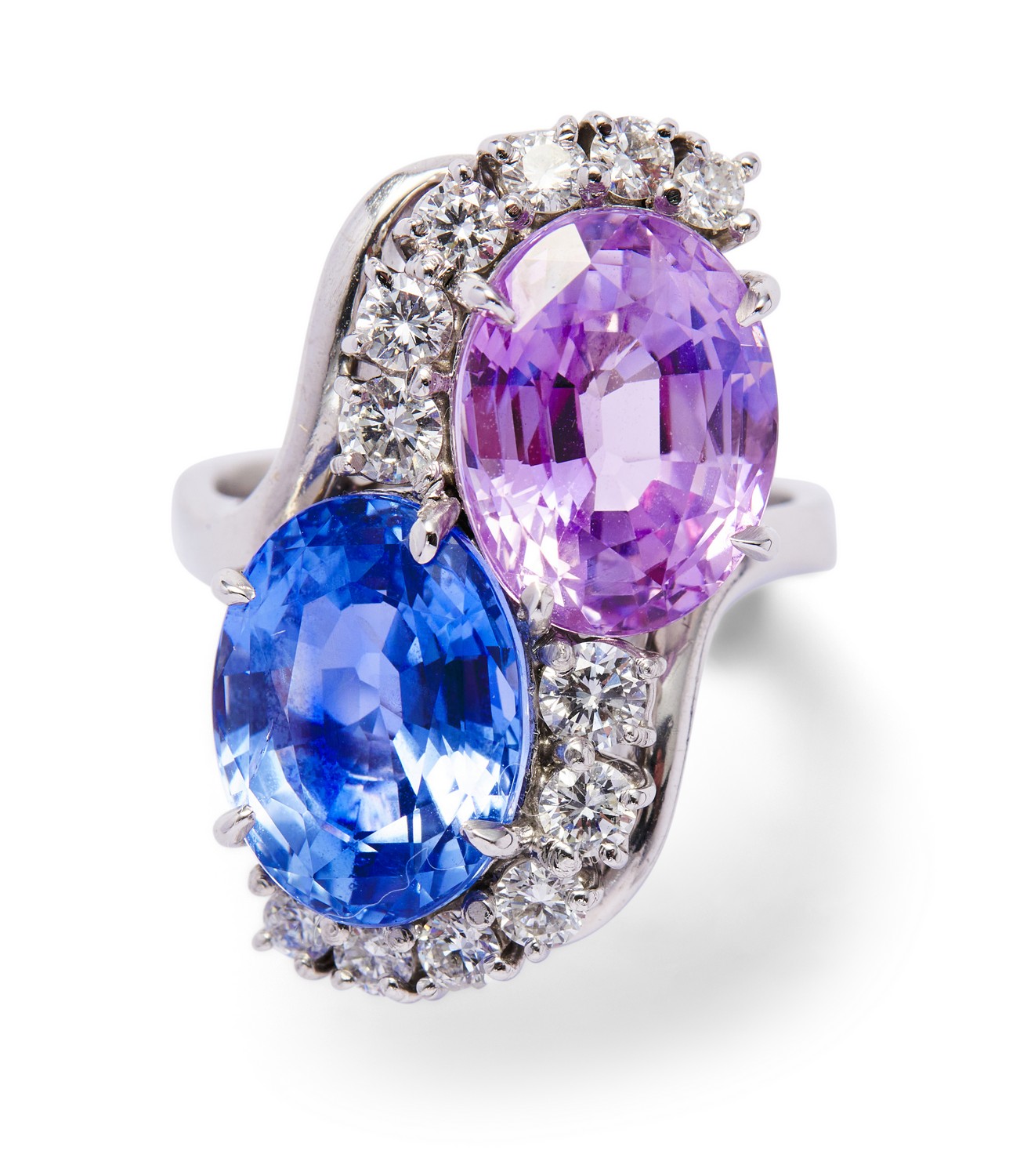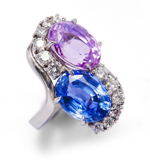 Of toi et moi design, one terminating in a claw-set oval modified mixed-cut blue sapphire weighing 7.05 carats, partially framed by brilliant-cut diamonds, the other similarly set with an oval modified mixed-cut pink sapphire weighing 8.02 carats, the diamonds together weighing approximately 0.85 carat, mounted in platinum, size M1/2.