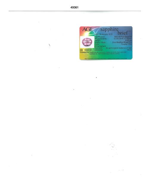 an AGL report numbered 1098153, dated 16 January 2019, stating that the 8.02 carat purplish pink sapphire is natural, with no indications of heating.