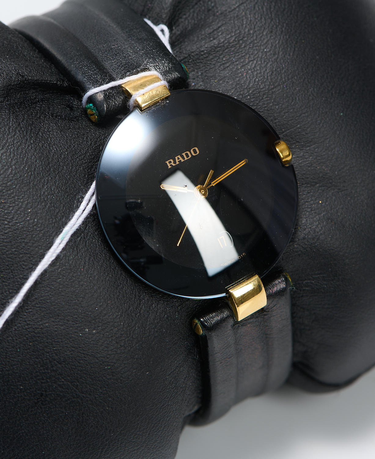 A JUBILE WRISTWATCH BY RADO, FEATURING LEATHER BAND, GOLD TONE ACCENTS AND DATE, QUARTZ MOVEMENT, DIAL DIAMAETER APPROXIMATELY 30MM