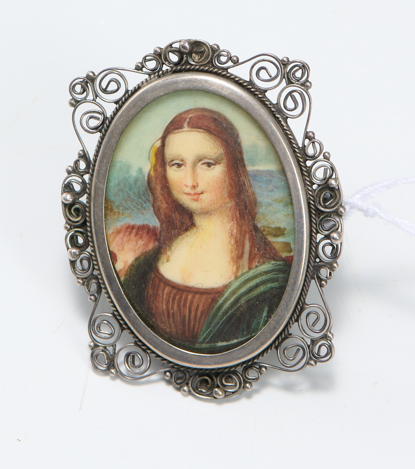 A MONA LISA PENDANT/BROOCH IN CONTINENTAL SILVER, APPROXIMATELY 40 X 31MM