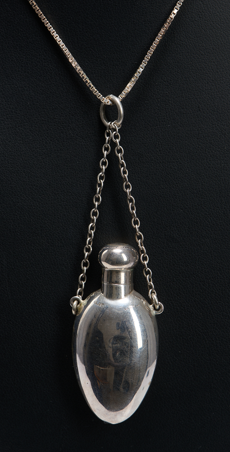 A PERFUME BOTTLE PENDANT IN STERLING SILVER TO A CONFORMING CHAIN, THE BOTTLE MEASURING APPROXIMATELY 44 X 26MM