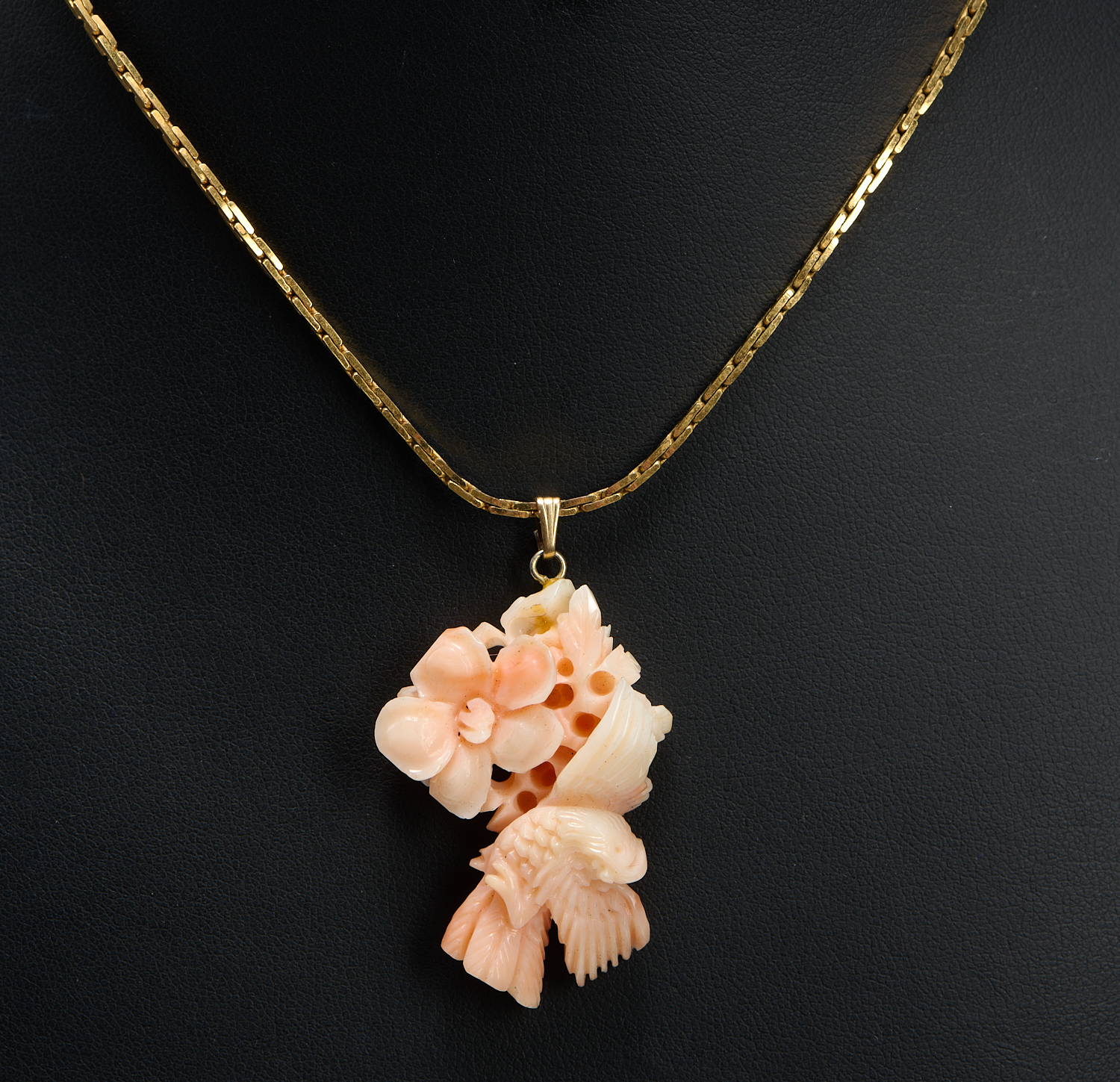 A CARVED CORAL PENDANT, TO A NECKLACE IN GOLD PLATE, THE PENDANT MEASURING 25 X 39MM, TOTAL CHAIN LENGTH APPROXIMATELY 380MM
