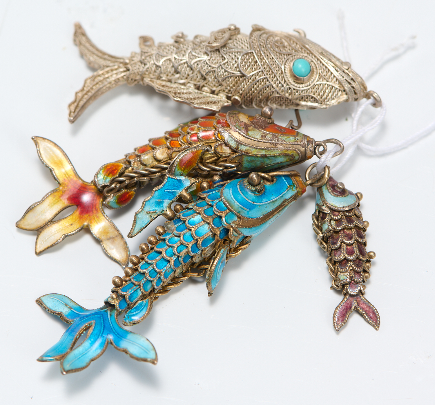 A COLLECTION OF FOUR FISH PENDANTS, THE LONGEST FISH APPROXIMATELY 50MM