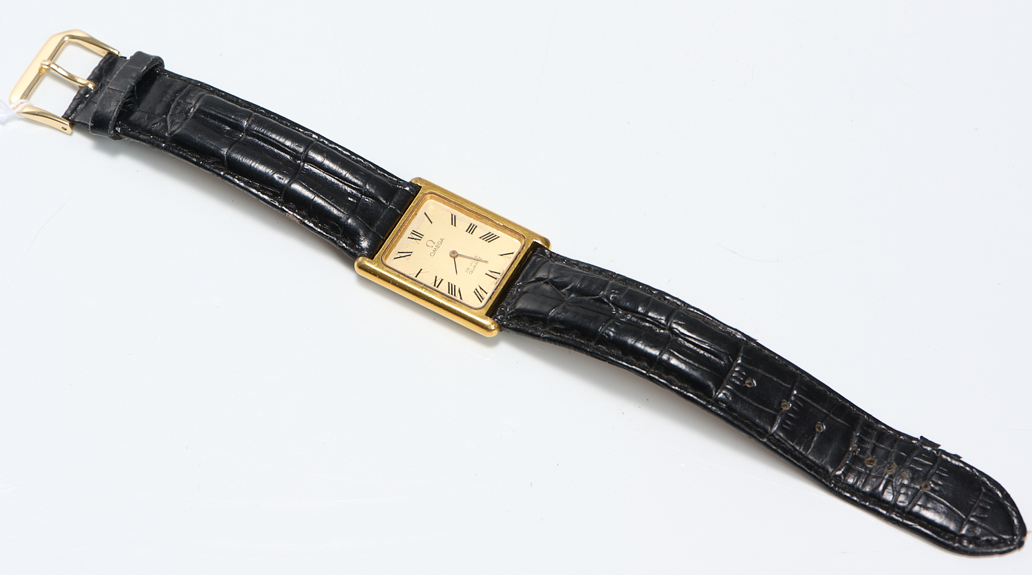 AN OMEGA DE VILLE QUARTZ WRISTWATCH, QUARTZ MOVEMENT, TO A LEATHER BAND
