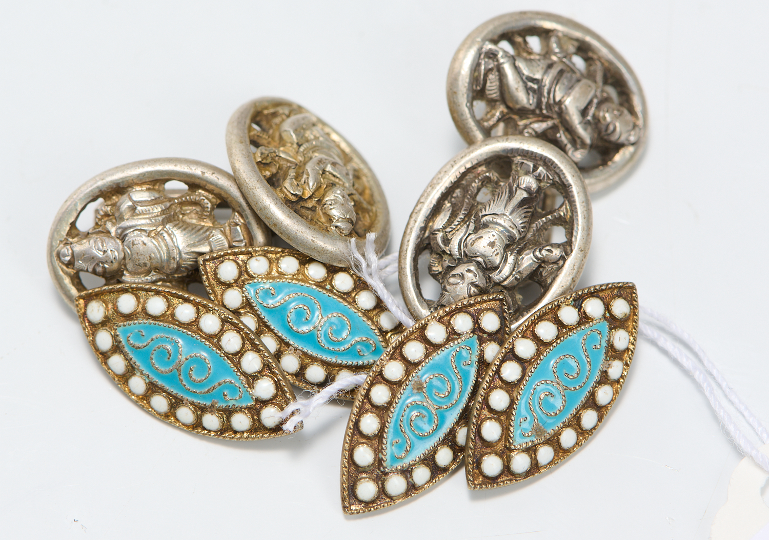 TWO PAIRS OF VINTAGE CUFFLINKS, IN GOLD PLATE AND STERLING SILVER, ONE ENAMEL SET