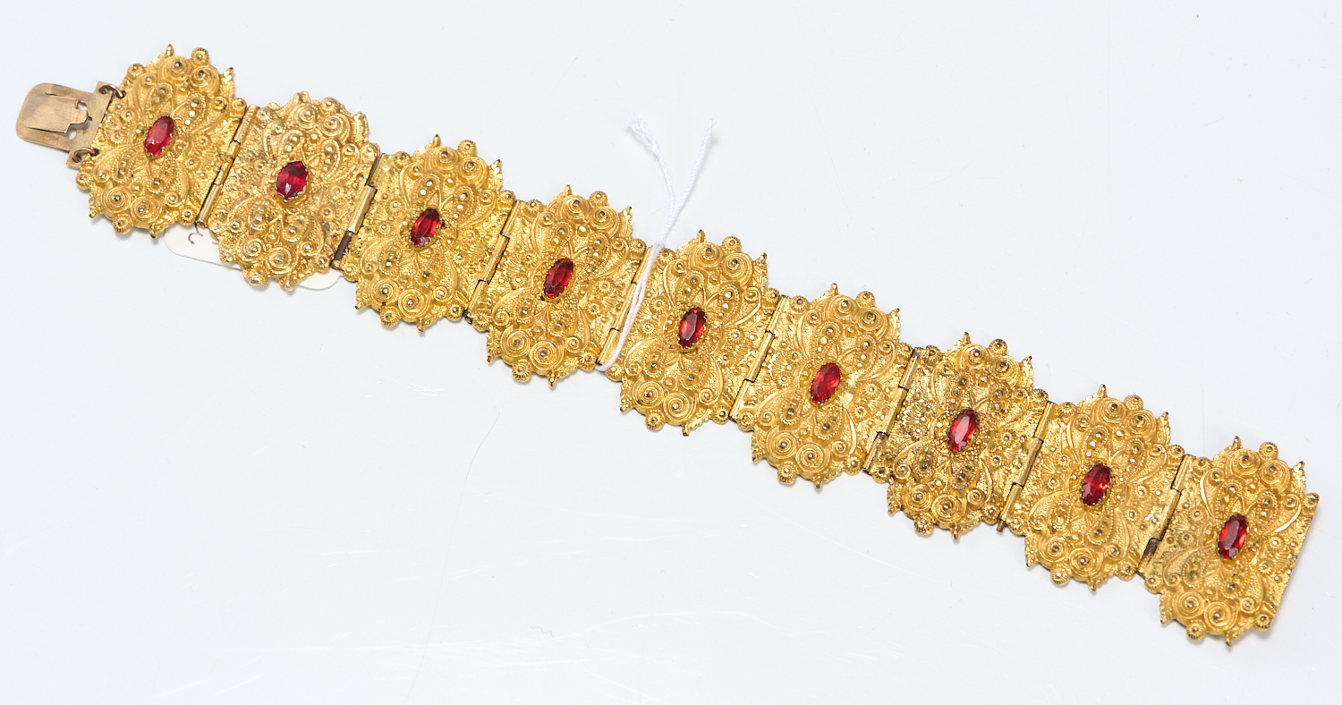 A PASTE SET BRACELET IN GOLD PLATED METAL, WIDTH 30MM, LENGTH 190MM