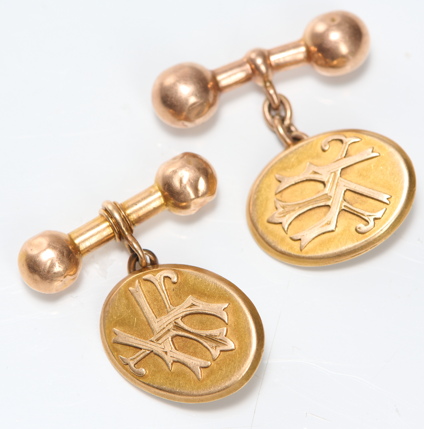 A PAIR OF ANTIQUE CUFFLINKS, WITH FACES IN 15CT GOLD AND TOGGLES IN 9CT GOLD, 10.8GMS