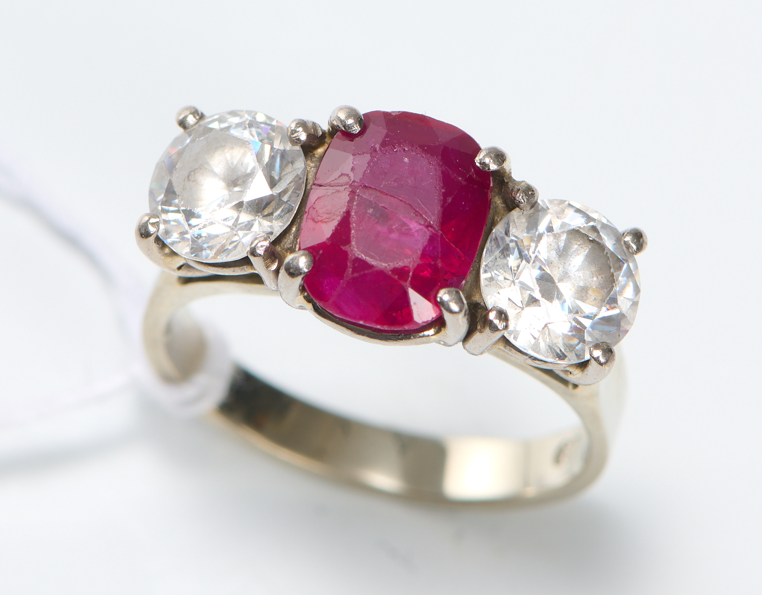 A SYNTHETIC RUBY AND PASTE SET RING IN 18CT WHITE GOLD, RING SIZE M, 5.9GMS